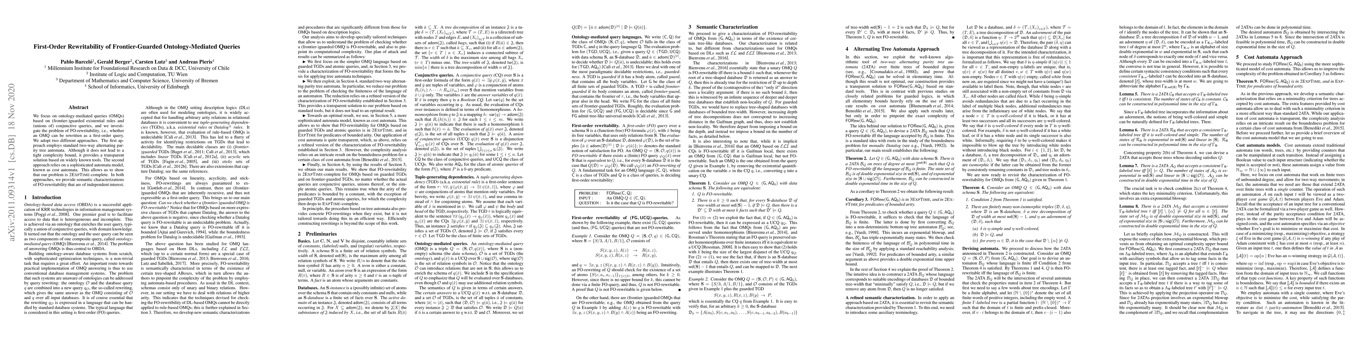 This paper explores the first-order (FO) rewritability of ontology-mediated queries (OMQs) based on guarded rules and conjunctive queries. It presents two approaches: one using two-way alternating parity tree automata and another using cost automata, which establishes a 2ExpTime-complete complexity bound and provides independent semantic characterizations of FO-rewritability.