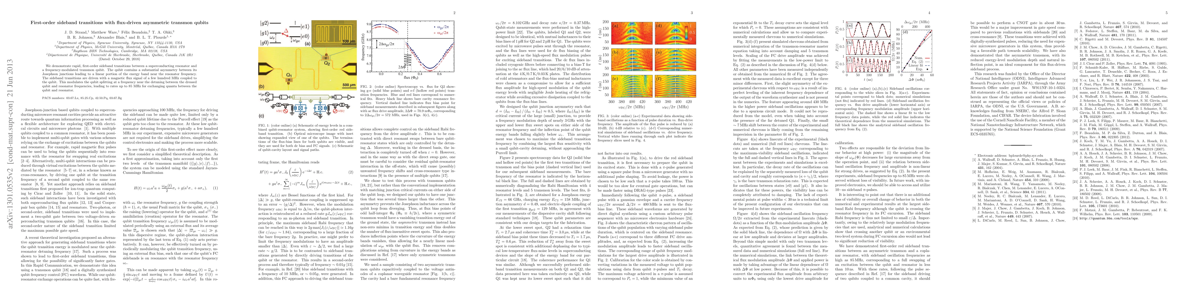 We demonstrate rapid, first-order sideband transitions between a superconducting resonator and a frequency-modulated transmon qubit. The qubit contains a substantial asymmetry between its Josephson junctions leading to a linear portion of the energy band near the resonator frequency. The sideband transitions are driven with a magnetic flux signal of a few hundred MHz coupled to the qubit. This modulates the qubit splitting at a frequency near the detuning between the dressed qubit and resonator frequencies, leading to rates up to 85 MHz for exchanging quanta between the qubit and resonator.
