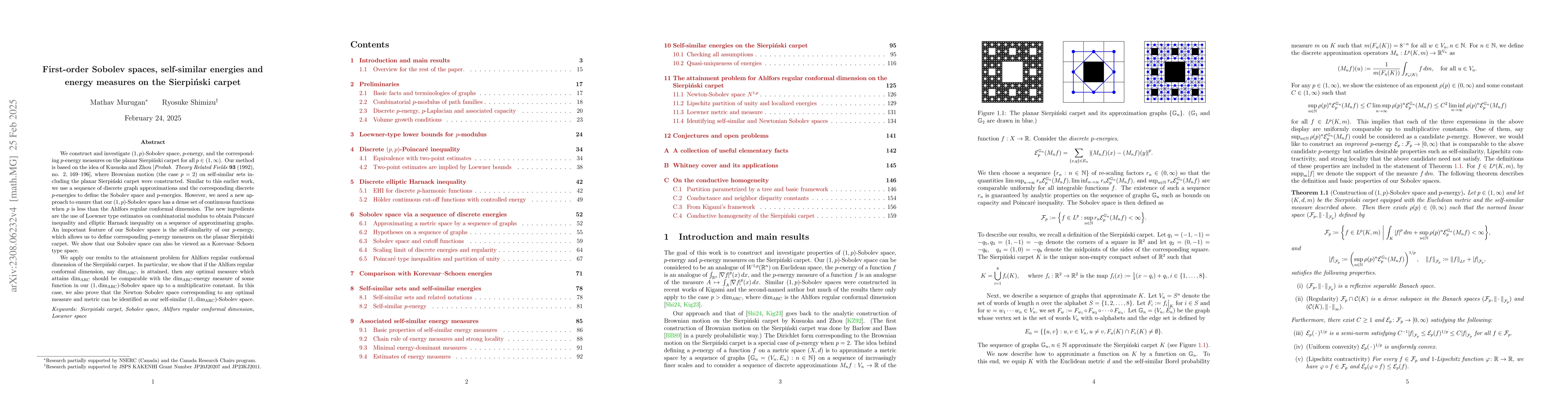 This paper constructs and investigates $(1, p)$-Sobolev spaces and $p$-energy measures on the Sierpiński carpet for $p \in (1, \infty)$. It employs a sequence of discrete graph approximations and uses Loewner type estimates to establish Poincaré and elliptic Harnack inequalities, ensuring the denseness of continuous functions in the Sobolev space. The self-similarity of the $p$-energy allows for the definition of corresponding $p$-energy measures, and the results are applied to the attainment problem for the Ahlfors regular conformal dimension of the Sierpiński carpet.