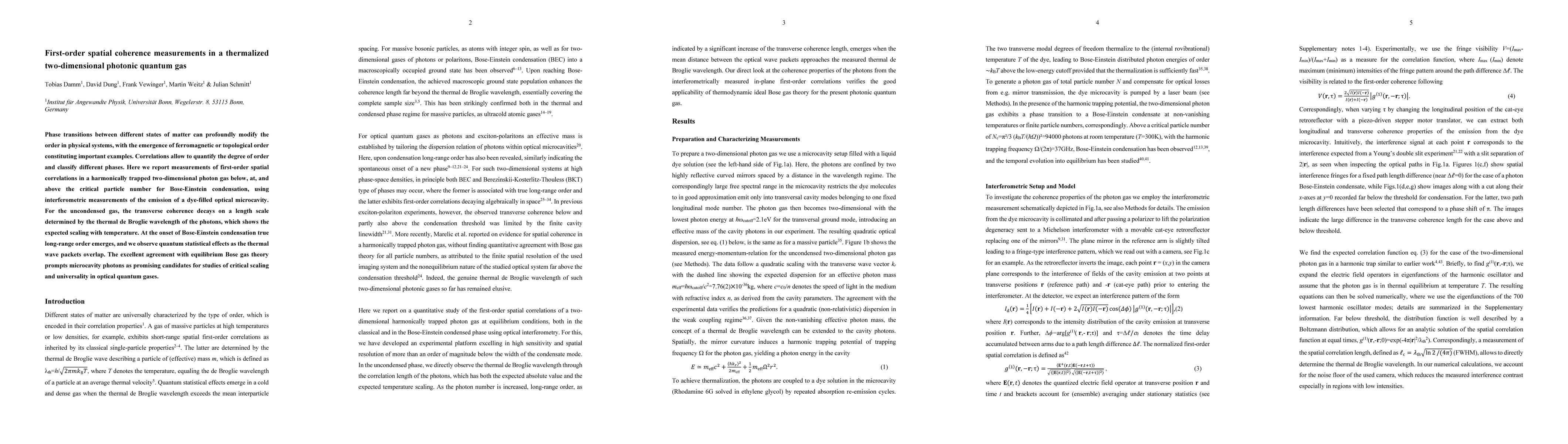 Phase transitions between different states of matter can profoundly modify the order in physical systems, with the emergence of ferromagnetic or topological order constituting important examples. Correlations allow to quantify the degree of order and classify different phases. Here we report measurements of first-order spatial correlations in a harmonically trapped two-dimensional photon gas below, at, and above the critical particle number for Bose-Einstein condensation, using interferometric measurements of the emission of a dye-filled optical microcavity. For the uncondensed gas, the transverse coherence decays on a length scale determined by the thermal de Broglie wavelength of the photons, which shows the expected scaling with temperature. At the onset of Bose-Einstein condensation true long-range order emerges, and we observe quantum statistical effects as the thermal wave packets overlap. The excellent agreement with equilibrium Bose gas theory prompts microcavity photons as promising candidates for studies of critical scaling and universality in optical quantum gases.