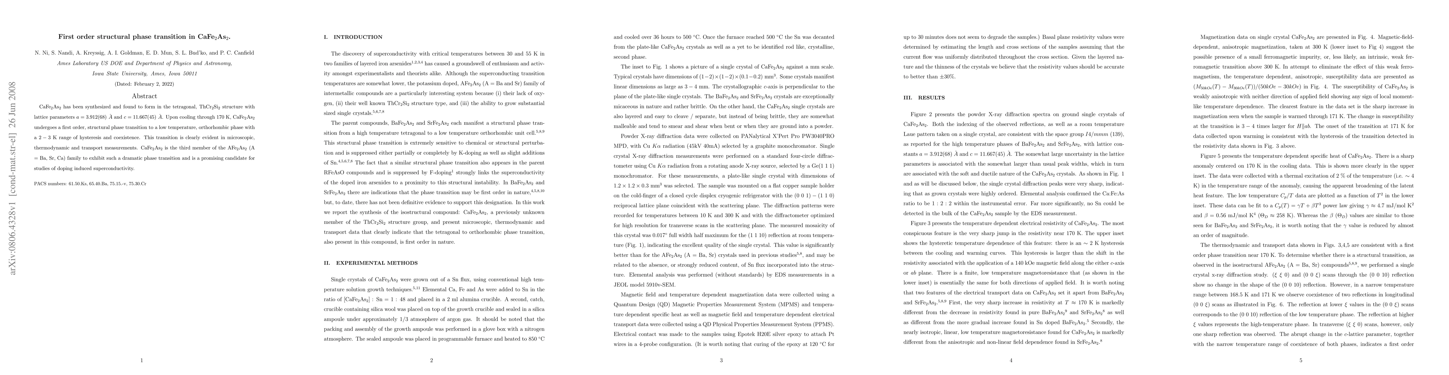 CaFe$_2$As$_2$ undergoes a first-order structural phase transition from tetragonal to orthorhombic at around 170 K, exhibiting hysteresis and coexistence over a 2-3 K range, indicating potential for superconductivity studies.