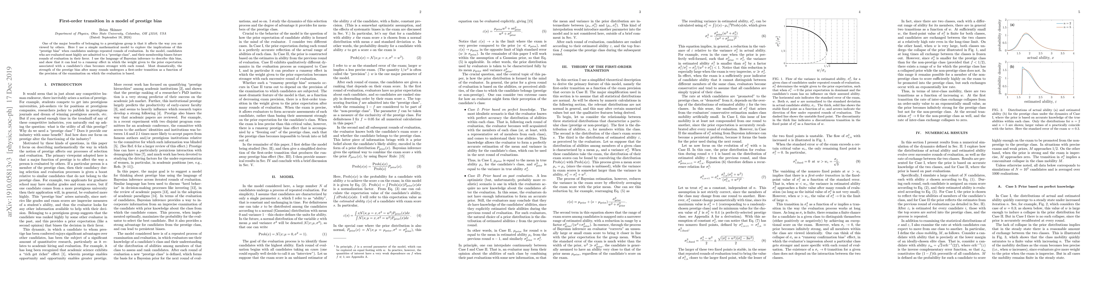 One of the major benefits of belonging to a prestigious group is that it affects the way you are viewed by others. Here I use a simple mathematical model to explore the implications of this "prestige bias" when candidates undergo repeated rounds of evaluation. In the model, candidates who are evaluated most highly are admitted to a "prestige class", and their membership biases future rounds of evaluation in their favor. I use the language of Bayesian inference to describe this bias, and show that it can lead to a runaway effect in which the weight given to the prior expectation associated with a candidate's class becomes stronger with each round. Most dramatically, the strength of the prestige bias after many rounds undergoes a first-order transition as a function of the precision of the examination on which the evaluation is based.