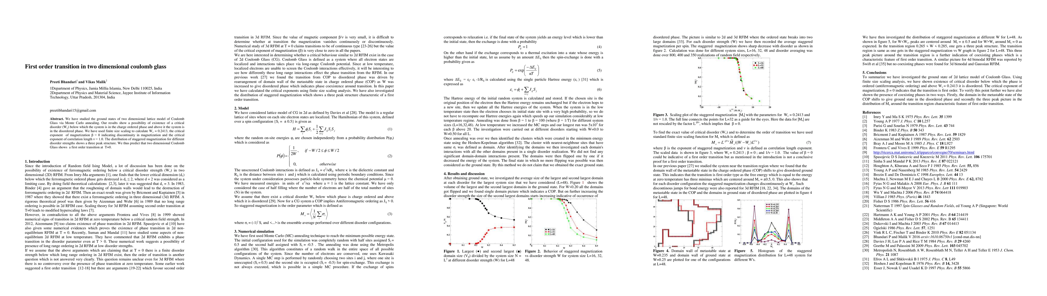The study uses Monte Carlo annealing to examine two-dimensional Coulomb Glass, identifying a critical disorder (Wc = 0.2413) that separates a charge-ordered phase from a disordered phase. The transition is found to be first-order, indicated by a discontinuous magnetization, critical exponents β = 1.0 and ν = 1.0, and a three-peak structure in staggered magnetization distribution at T=0.