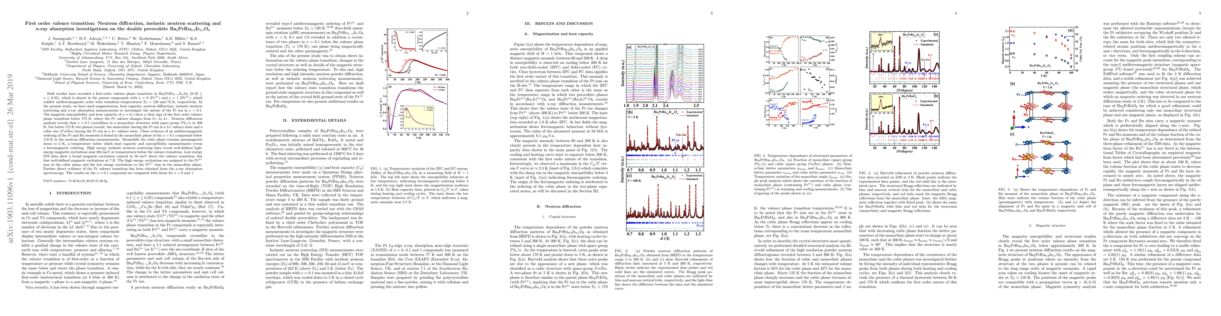 The research investigates a first-order valence phase transition in Ba$_2$PrRu$_{0.9}$Ir$_{0.1}$O$_6$ below 175 K, where Pr valence changes from 3+ to 4+. Neutron diffraction and x-ray absorption data confirm the coexistence of monoclinic and cubic phases with different Pr valences and reveal antiferromagnetic ordering in the monoclinic phase.
