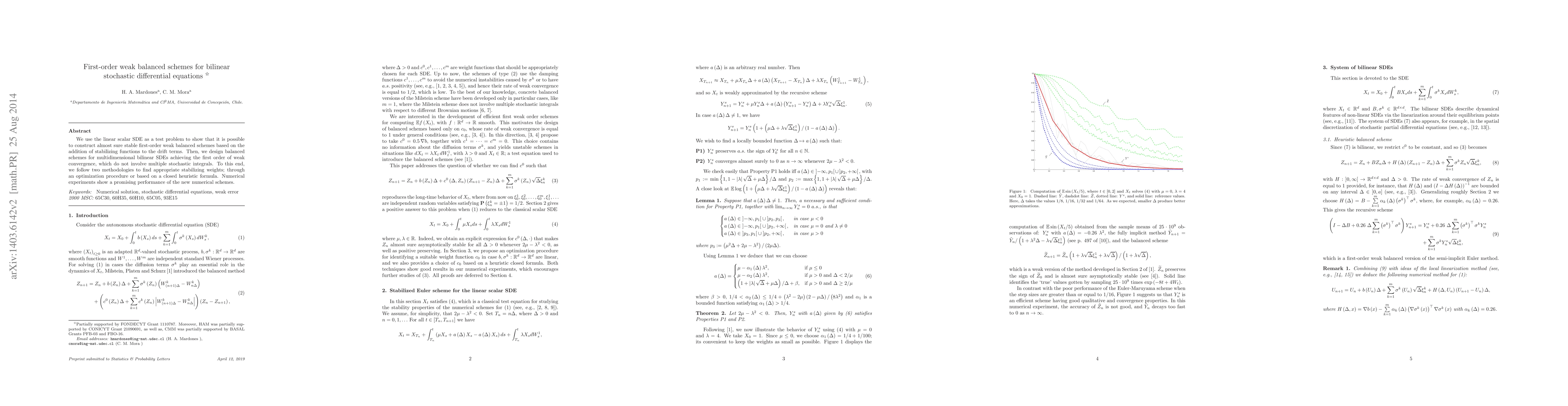 Researchers developed a new method for solving complex stochastic differential equations using first-order weak balanced schemes that achieve high accuracy without requiring multiple integrals. The approach uses optimization or heuristic formulas to select stabilizing weights, showing promising results in numerical experiments.