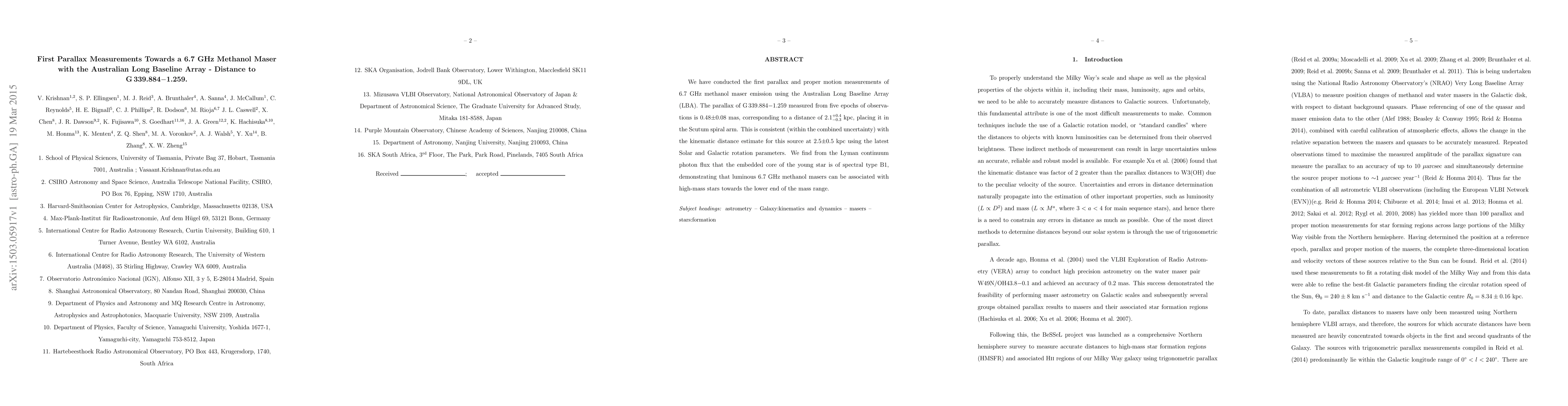 We have conducted the first parallax and proper motion measurements of 6.7 GHz methanol maser emission using the Australian Long Baseline Array (LBA). The parallax of G339.884$-$1.259 measured from five epochs of observations is 0.48$\pm $0.08 mas, corresponding to a distance of $2.1^{+0.4}_{-0.3}$ kpc, placing it in the Scutum spiral arm. This is consistent (within the combined uncertainty) with the kinematic distance estimate for this source at 2.5$\pm $0.5 kpc using the latest Solar and Galactic rotation parameters. We find from the Lyman continuum photon flux that the embedded core of the young star is of spectral type B1, demonstrating that luminous 6.7 GHz methanol masers can be associated with high-mass stars towards the lower end of the mass range.