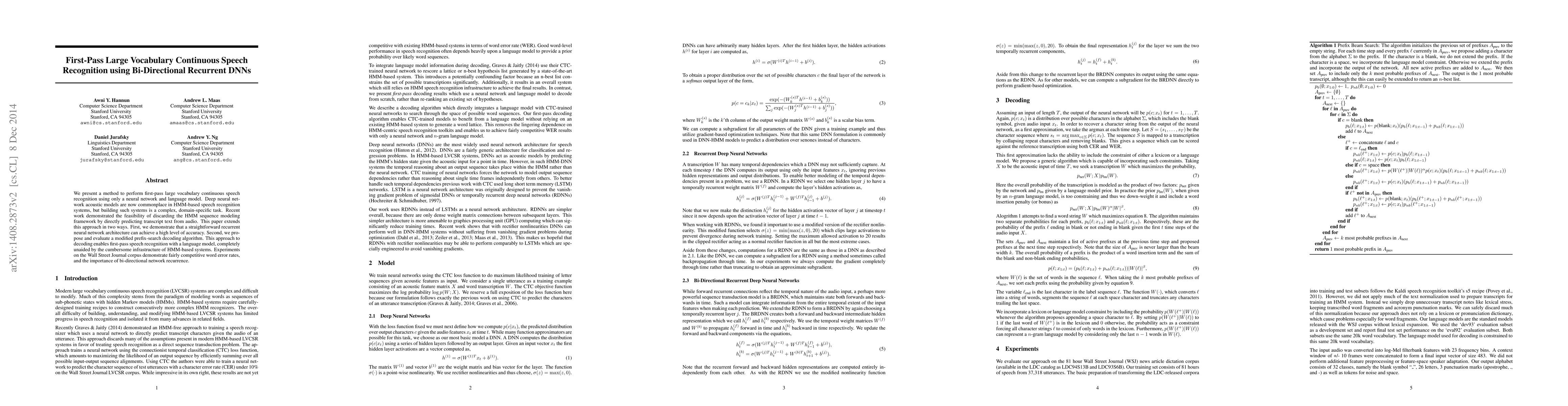 We present a method to perform first-pass large vocabulary continuous speech recognition using only a neural network and language model. Deep neural network acoustic models are now commonplace in HMM-based speech recognition systems, but building such systems is a complex, domain-specific task. Recent work demonstrated the feasibility of discarding the HMM sequence modeling framework by directly predicting transcript text from audio. This paper extends this approach in two ways. First, we demonstrate that a straightforward recurrent neural network architecture can achieve a high level of accuracy. Second, we propose and evaluate a modified prefix-search decoding algorithm. This approach to decoding enables first-pass speech recognition with a language model, completely unaided by the cumbersome infrastructure of HMM-based systems. Experiments on the Wall Street Journal corpus demonstrate fairly competitive word error rates, and the importance of bi-directional network recurrence.
