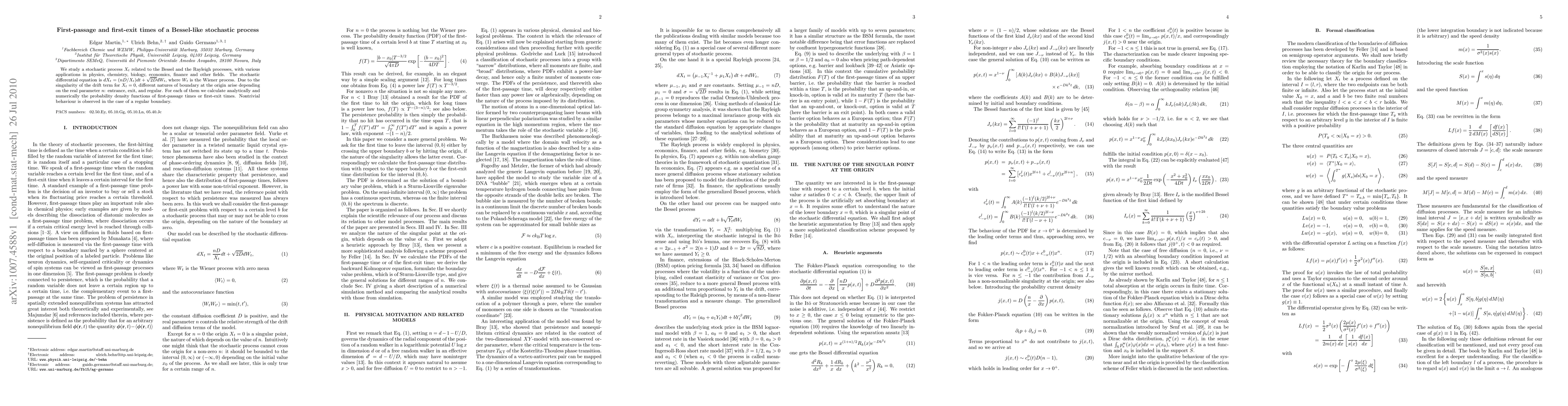 This paper investigates a Bessel-like stochastic process $X_t$ with applications across various fields, characterized by the stochastic differential equation $dX_t = (nD/X_t) dt + \sqrt{2D} dW_t$. It analytically and numerically examines the probability density functions of first-passage and first-exit times, revealing nontrivial behavior at a regular boundary.
