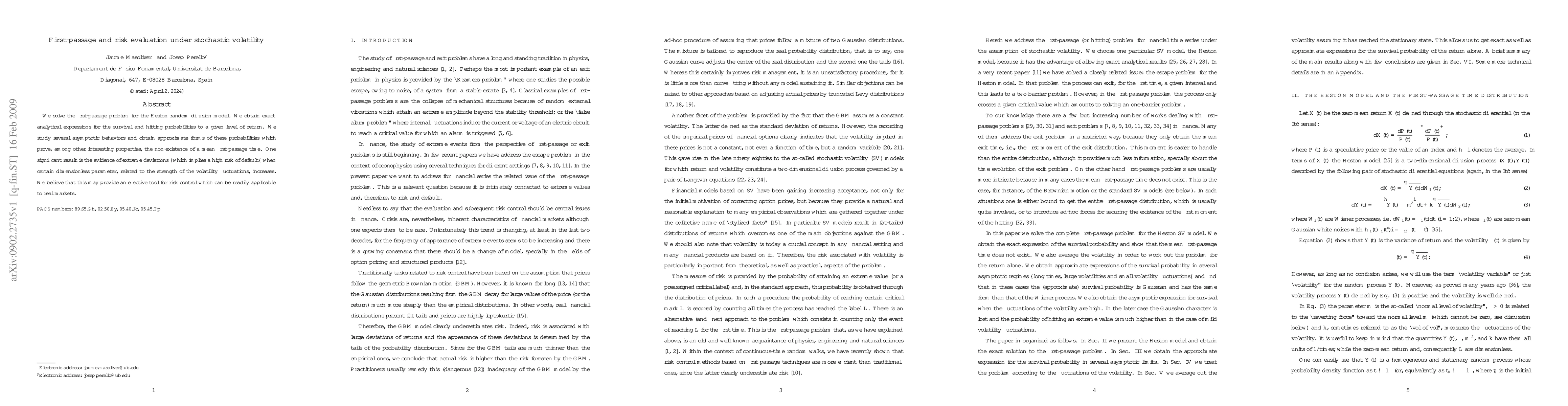 We solve the first-passage problem for the Heston random diffusion model. We obtain exact analytical expressions for the survival and hitting probabilities to a given level of return. We study several asymptotic behaviors and obtain approximate forms of these probabilities which prove, among other interesting properties, the non-existence of a mean first-passage time. One significant result is the evidence of extreme deviations --which implies a high risk of default-- when certain dimensionless parameter, related to the strength of the volatility fluctuations, increases. We believe that this may provide an effective tool for risk control which can be readily applicable to real markets.