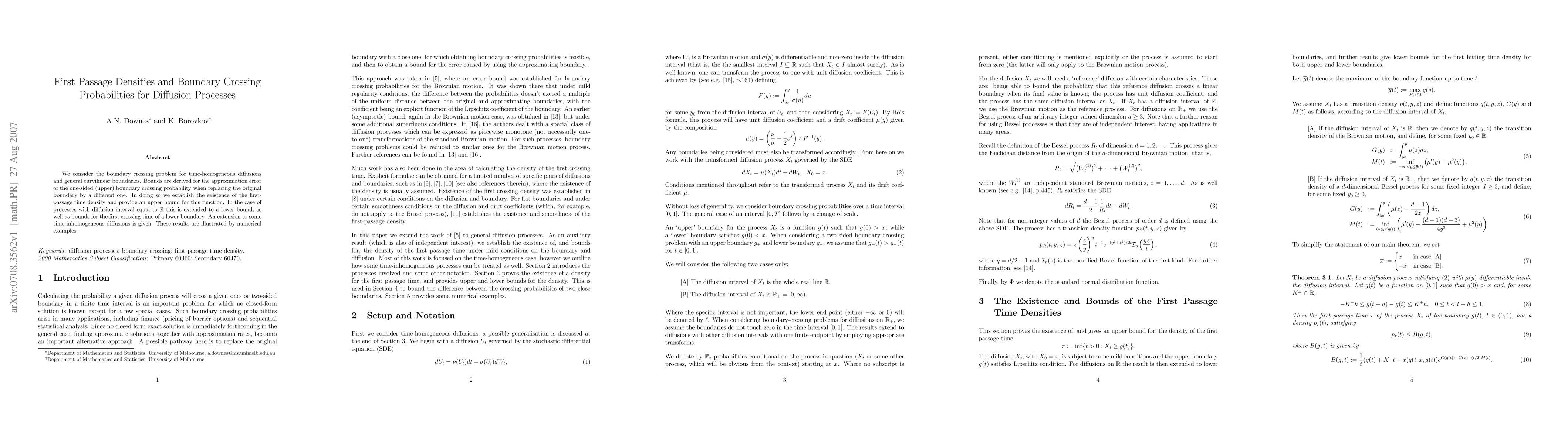 This paper derives bounds for the approximation error in boundary crossing probabilities for time-homogeneous diffusions, establishing the existence and upper bounds for first-passage time densities. It extends these results to time-inhomogeneous diffusions and provides numerical examples to illustrate the findings.
