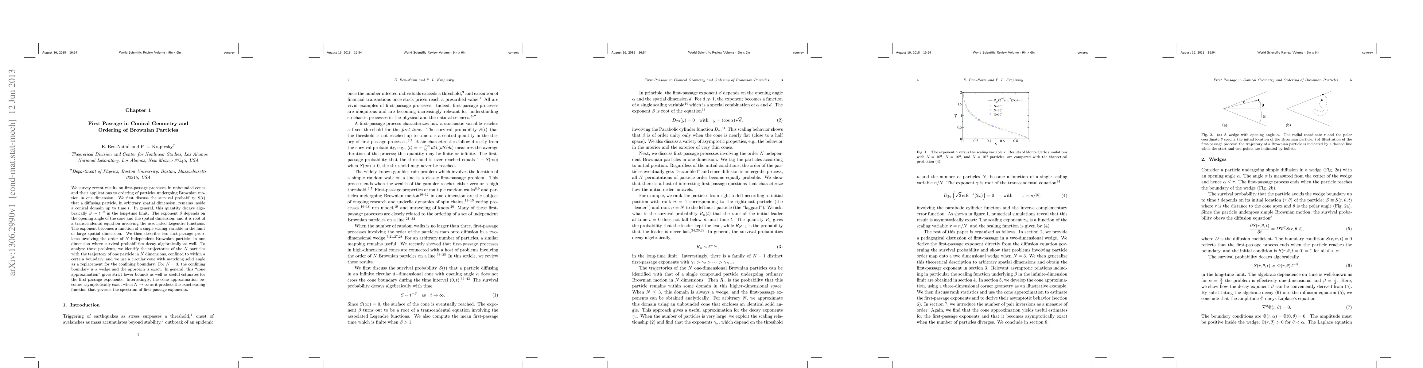 We survey recent results on first-passage processes in unbounded cones and their applications to ordering of particles undergoing Brownian motion in one dimension. We first discuss the survival probability S(t) that a diffusing particle, in arbitrary spatial dimension, remains inside a conical domain up to time t. In general, this quantity decays algebraically S ~ t^{-beta} in the long-time limit. The exponent beta depends on the opening angle of the cone and the spatial dimension, and it is root of a transcendental equation involving the associated Legendre functions. The exponent becomes a function of a single scaling variable in the limit of large spatial dimension. We then describe two first-passage problems involving the order of N independent Brownian particles in one dimension where survival probabilities decay algebraically as well. To analyze these problems, we identify the trajectories of the N particles with the trajectory of one particle in N dimensions, confined to within a certain boundary, and we use a circular cone with matching solid angle as a replacement for the confining boundary. For N=3, the confining boundary is a wedge and the approach is exact. In general, this "cone approximation" gives strict lower bounds as well as useful estimates or the first-passage exponents. Interestingly, the cone approximation becomes asymptotically exact when N-->infinity as it predicts the exact scaling function that governs the spectrum of first-passage exponents.