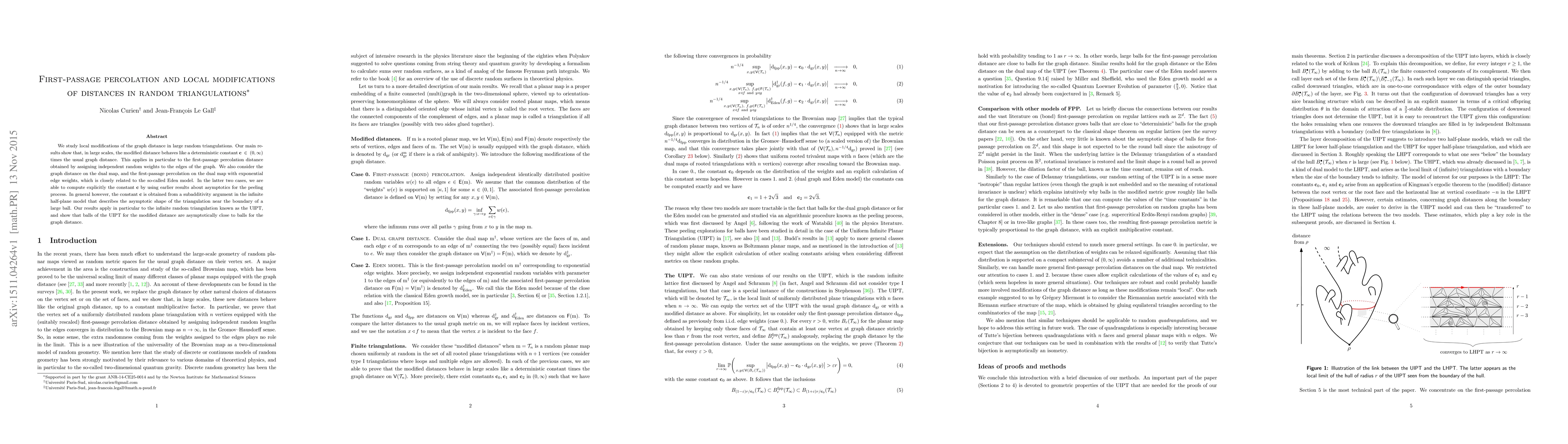 This paper investigates how local modifications of graph distances in large random triangulations behave, showing that they scale like a constant factor times the usual graph distance. The results apply to first-passage percolation and the dual map, with explicit computations for certain cases.