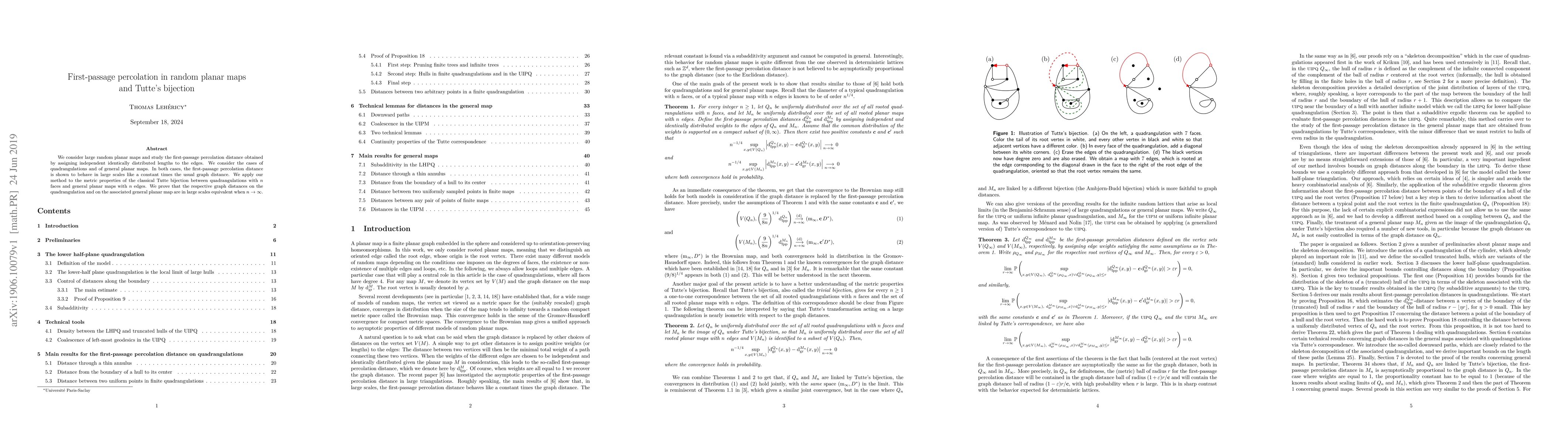 This paper investigates first-passage percolation in large random planar maps, showing that the percolation distance behaves like a constant times the usual graph distance. It also applies these findings to the metric properties of Tutte's bijection, proving that the graph distances on quadrangulations and associated general planar maps converge as the number of faces/edges tends to infinity.