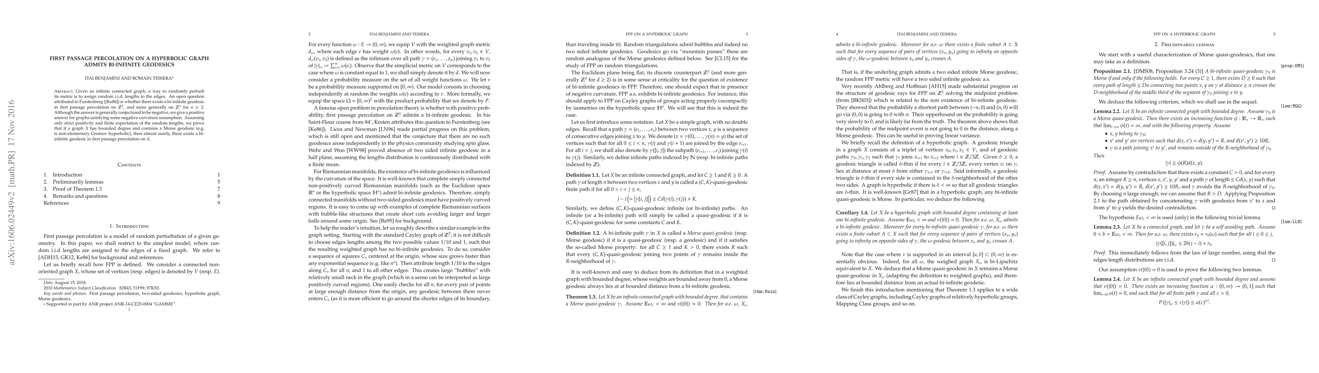 Researchers prove that on certain hyperbolic graphs with positive curvature, a random process called first passage percolation creates a bi-infinite geodesic almost surely. This contradicts the general conjecture that such processes do not produce infinite geodesics.