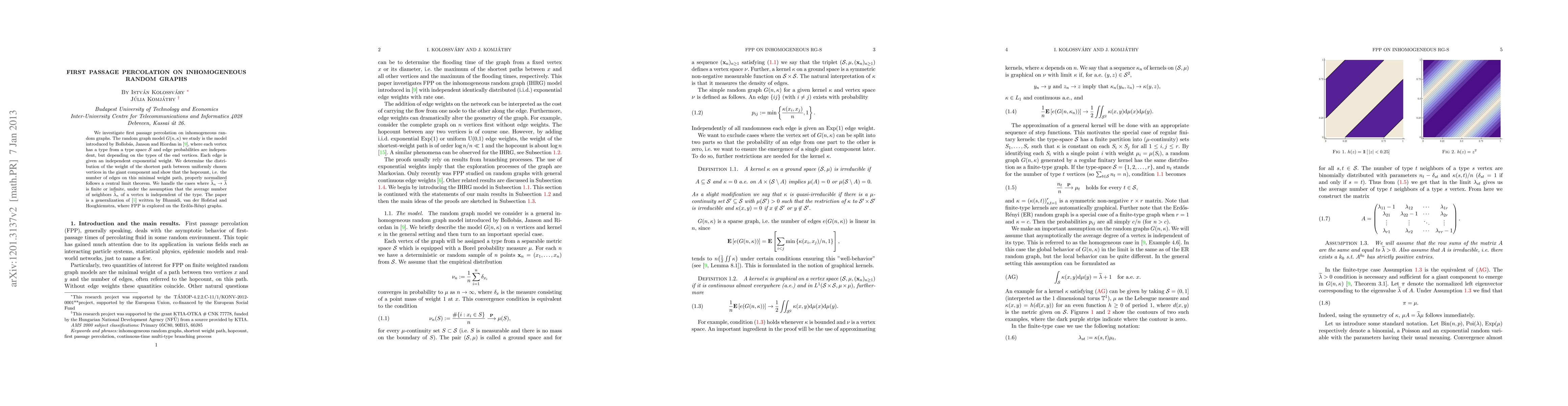 This paper examines first passage percolation on inhomogeneous random graphs where edge probabilities depend on vertex types. It determines the distribution of the weight of the shortest path in the giant component and shows that the normalized hopcount follows a central limit theorem, extending similar results from Erdos-Renyi graphs.