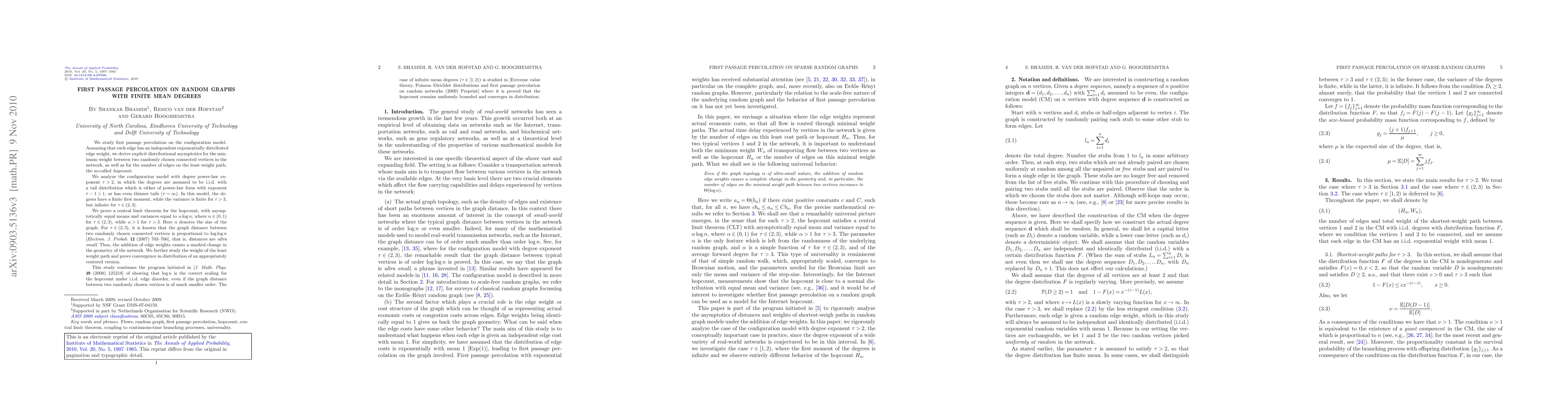 This paper investigates first passage percolation on random graphs with finite mean degrees, focusing on the configuration model with power-law degree distributions. It derives distributional asymptotics for the minimum weight between two vertices and the hopcount, proving a central limit theorem for the hopcount and showing that the addition of edge weights significantly alters network geometry.