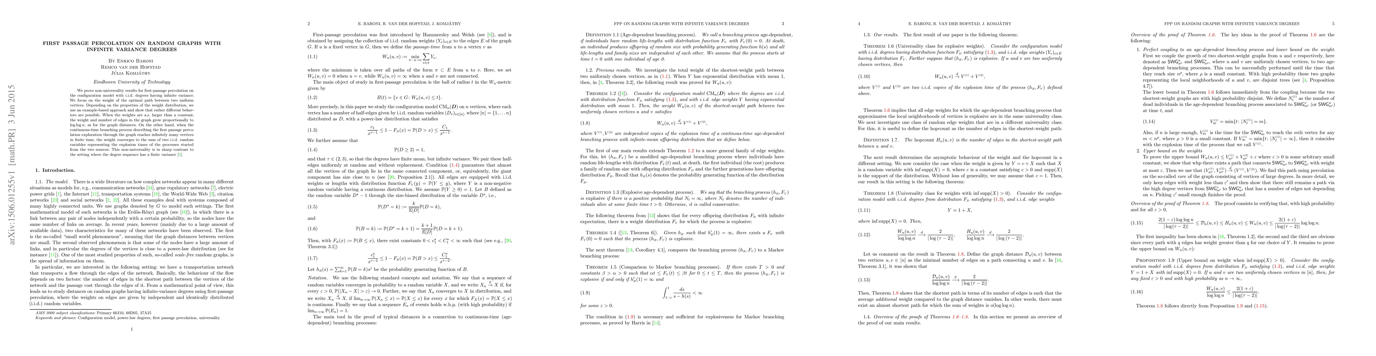This paper demonstrates non-universality in first-passage percolation on random graphs with infinite variance degrees, showing distinct behaviors based on weight distribution. When weights are large, the optimal path's weight and edge count scale with loglog(n); when the branching process explodes, the weight converges to the sum of two random variables.