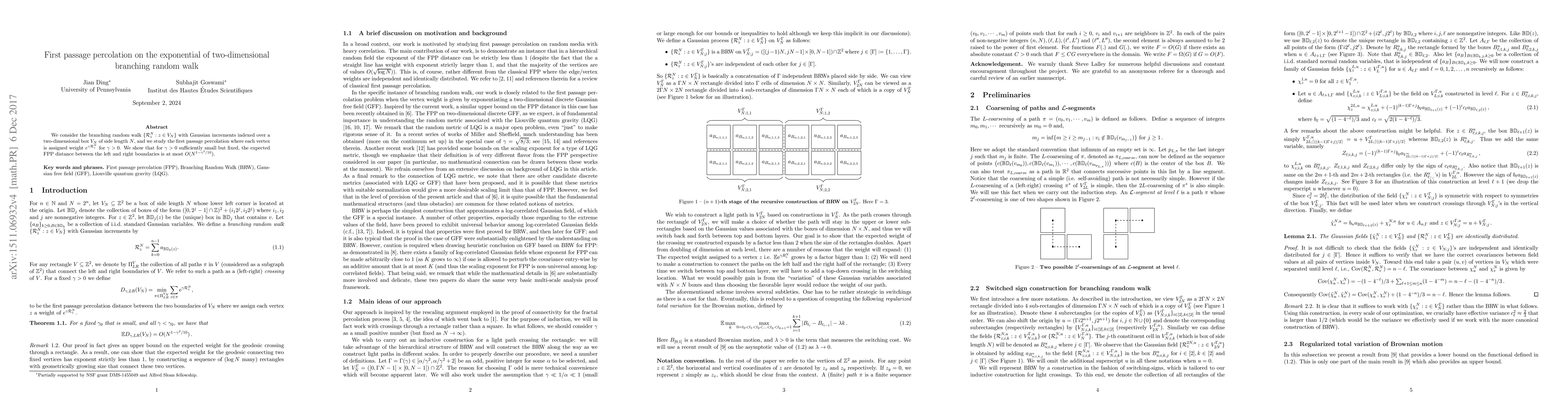 Summary: This paper investigates the first passage percolation on a branching random walk with Gaussian increments in a two-dimensional box, showing that for small but fixed $\gamma > 0$, the expected distance between the left and right boundaries is $O(N^{1 - \gamma^2/10})$.