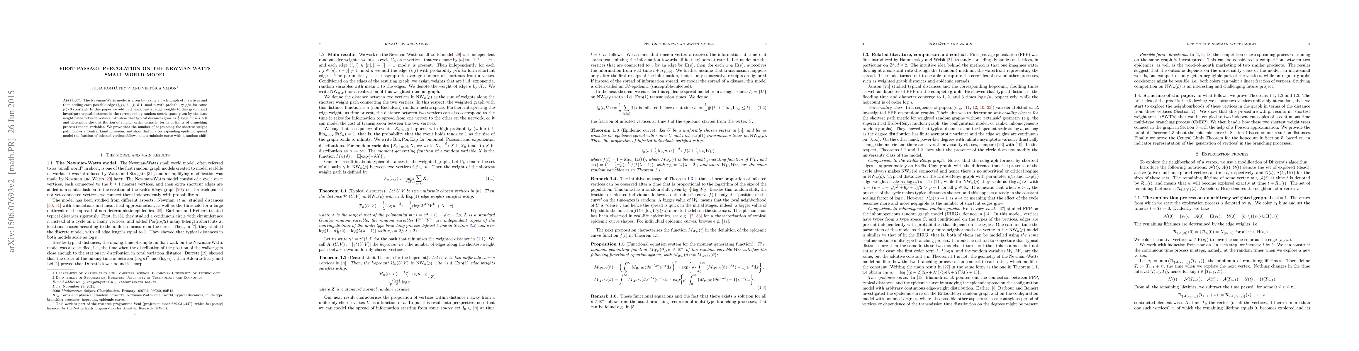 This paper studies first passage percolation on the Newman-Watts small world model with exponential edge weights, showing that typical distances grow as $\frac{1}{\lambda} \log n$ and that the number of edges in the shortest path follows a Central Limit Theorem, while also exploring its implications in an epidemic spread model.