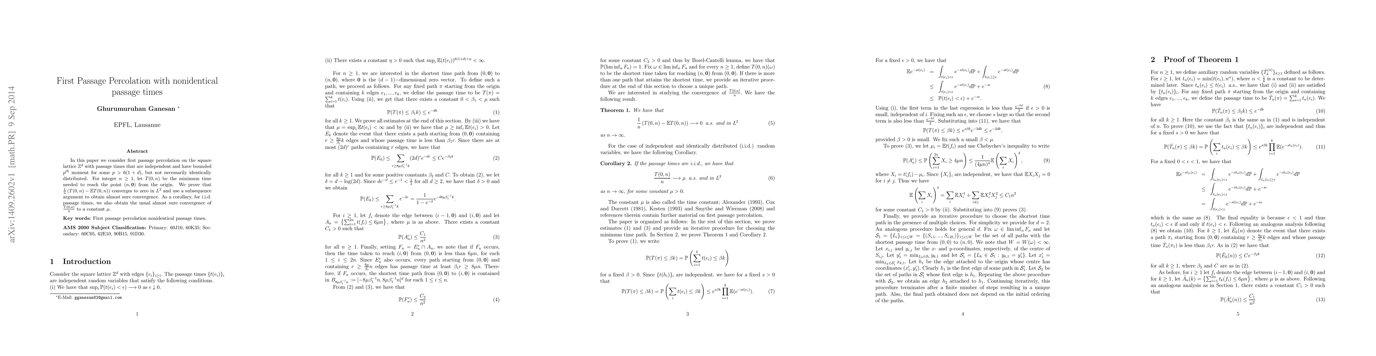 This paper studies first passage percolation on \(\mathbb{Z}^d\) with nonidentical passage times having bounded \(p^{th}\) moments. It proves that the normalized time to reach \((n,\mathbf{0})\) converges to zero in \(L^2\) and almost surely, with a corollary for i.i.d. passage times showing almost sure convergence to a constant \(\mu\).