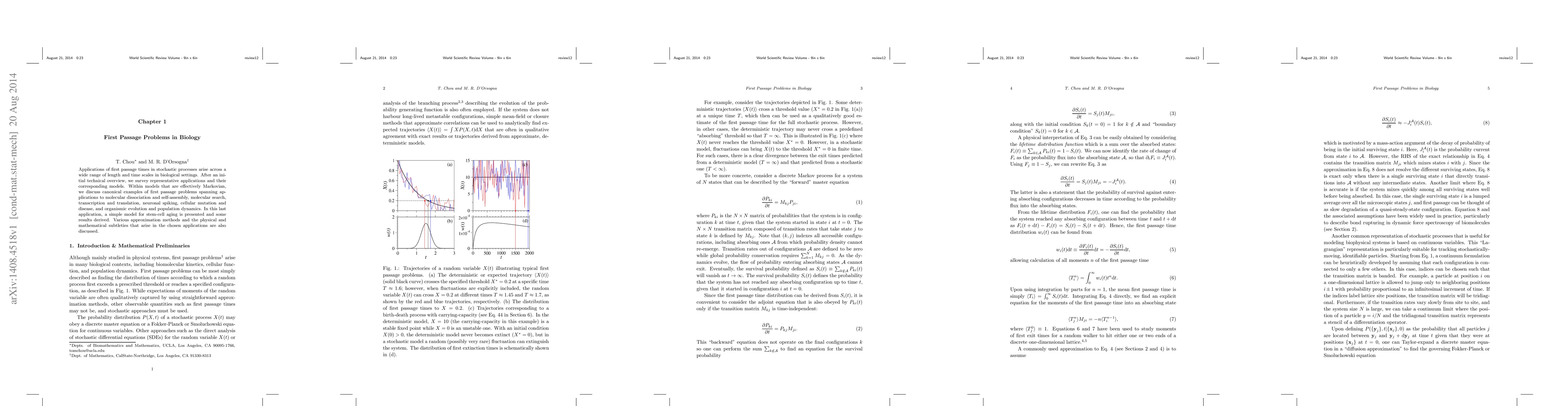 This paper explores the application of first passage times in stochastic processes within diverse biological contexts, from molecular interactions to organismic evolution. It discusses various Markovian models, approximation methods, and unique cases like stem-cell aging, highlighting both the methodology and implications across different biological scales.