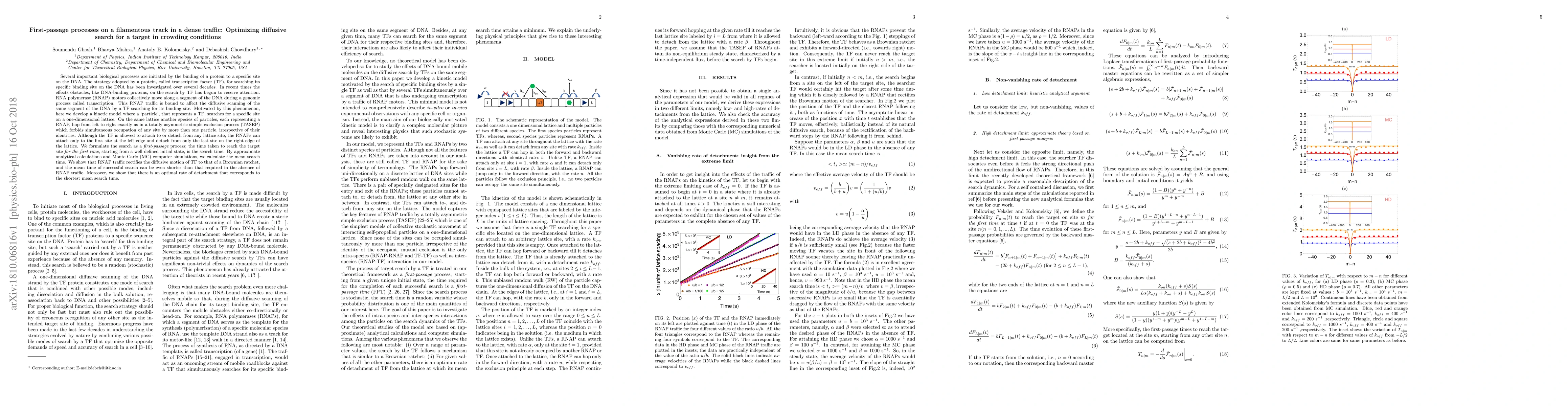 Several important biological processes are initiated by the binding of a protein to a specific site on the DNA. The strategy adopted by a protein, called transcription factor (TF), for searching its specific binding site on the DNA has been investigated over several decades. In recent times the effects obstacles, like DNA-binding proteins, on the search by TF has begun to receive attention. RNA polymerase (RNAP) motors collectively move along a segment of the DNA during a genomic process called transcription. This RNAP traffic is bound to affect the diffusive scanning of the same segment of the DNA by a TF searching for its binding site. Motivated by this phenomenon, here we develop a kinetic model where a `particle', that represents a TF, searches for a specific site on a one-dimensional lattice. On the same lattice another species of particles, each representing a RNAP, hop from left to right exactly as in a totally asymmetric simple exclusion process (TASEP) which forbids simultaneous occupation of any site by more than one particle, irrespective of their identities. Although the TF is allowed to attach to or detach from any lattice site, the RNAPs can attach only to the first site at the left edge and detach from only the last site on the right edge of the lattice. We formulate the search as a {\it first-passage} process; the time taken to reach the target site {\it for the first time}, starting from a well defined initial state, is the search time. By approximate analytical calculations and Monte Carlo (MC) computer simulations, we calculate the mean search time. We show that RNAP traffic rectifies the diffusive motion of TF to that of a Brownian ratchet, and the mean time of successful search can be even shorter than that required in the absence of RNAP traffic. Moreover, we show that there is an optimal rate of detachment that corresponds to the shortest mean search time.