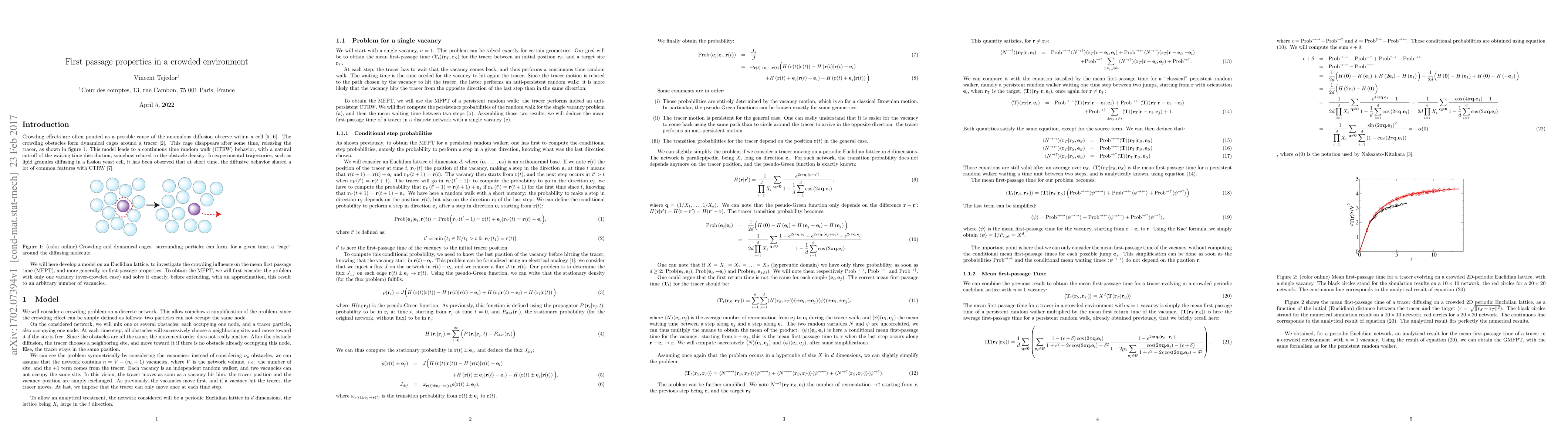 This paper develops a model to calculate the first-passage time for a random walker in a crowded environment, showing that crowding induces memory effects leading to persistent-like behavior, and compares it to the Nakazato-Kitahara model.
