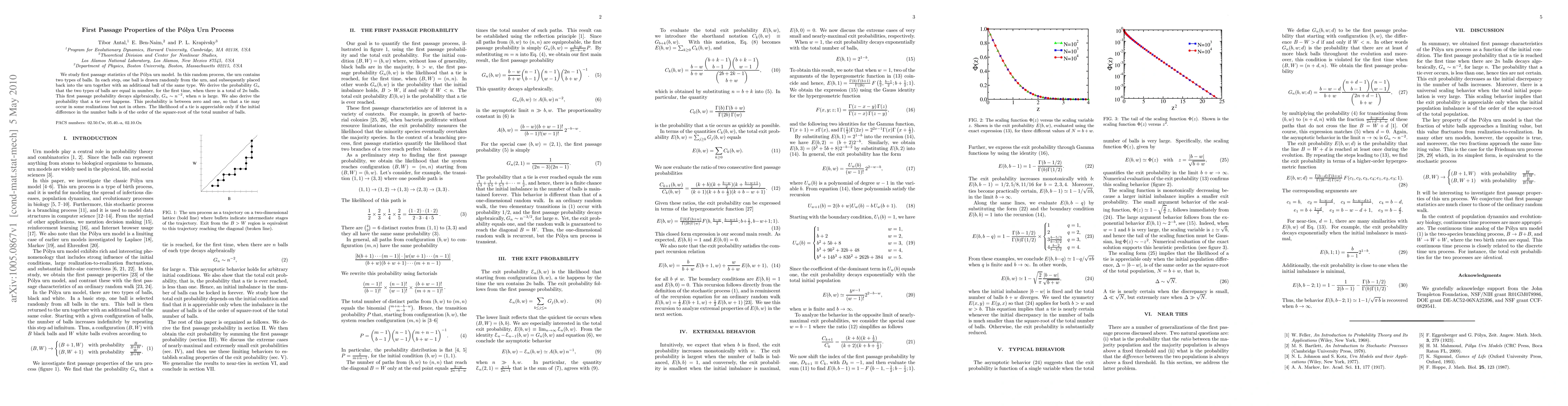 This paper investigates first passage properties of the Polya urn model, deriving the probability of equal numbers of two ball types for the first time among 2n balls, which decays algebraically as n^{-2} for large n. It also finds that the probability of ever achieving a tie lies between zero and one, with significant likelihood only if the initial difference is of the order of the square root of the total number of balls.