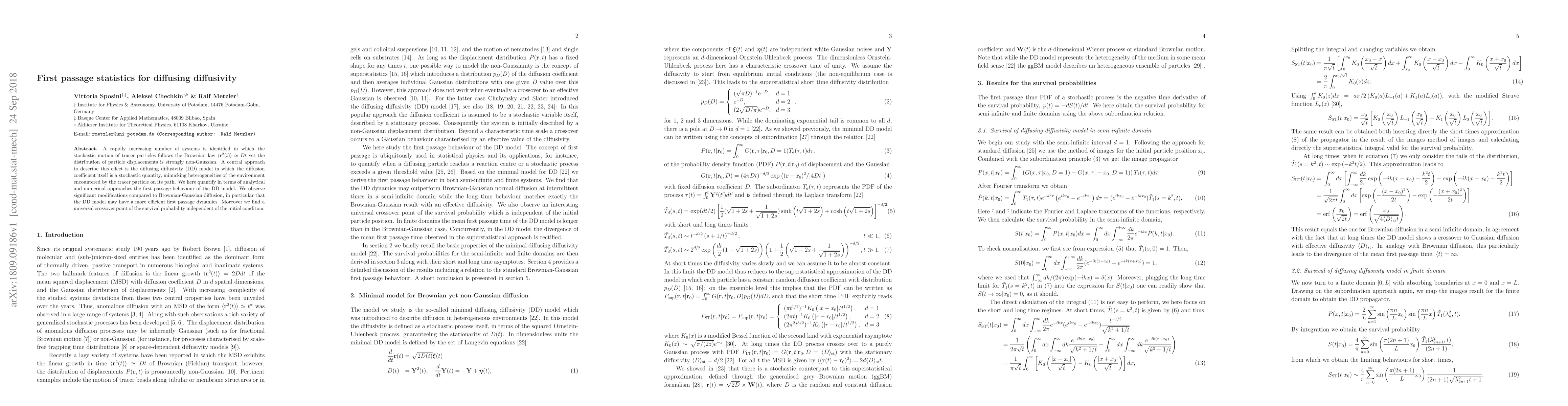 The paper presents an in-depth analysis of the first passage statistics for the diffusing diffusivity model, providing analytical expressions for survival probabilities in semi-infinite and finite domains.