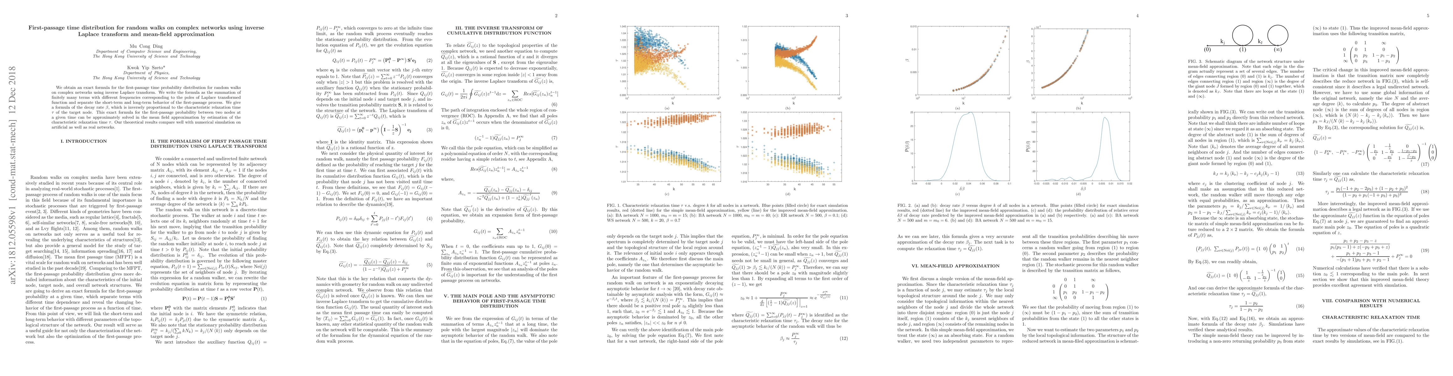 This paper derives an exact formula for the first-passage time distribution in random walks on complex networks using inverse Laplace transform, separating short-term and long-term behaviors. It also provides an approximate solution via mean-field approximation and validates the theoretical results with numerical simulations on both artificial and real networks.