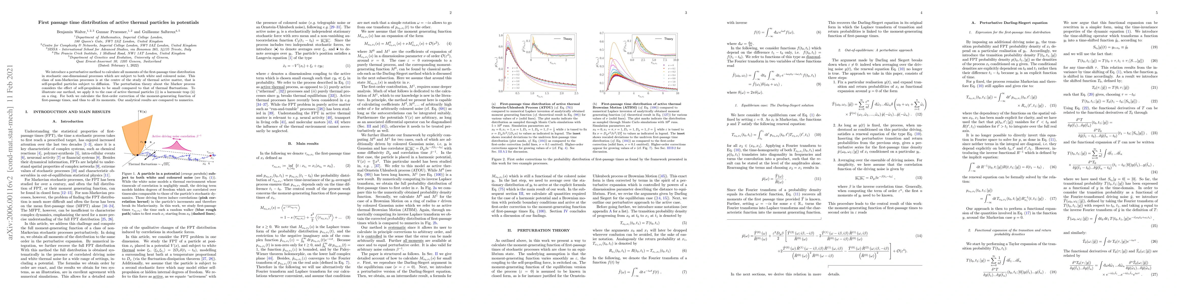 We introduce a perturbative method to calculate all moments of the first-passage time distribution in stochastic one-dimensional processes which are subject to both white and coloured noise. This class of non-Markovian processes is at the centre of the study of thermal active matter, that is self-propelled particles subject to diffusion. The perturbation theory about the Markov process considers the effect of self-propulsion to be small compared to that of thermal fluctuations. To illustrate our method, we apply it to the case of active thermal particles (i) in a harmonic trap (ii) on a ring. For both we calculate the first-order correction of the moment-generating function of first-passage times, and thus to all its moments. Our analytical results are compared to numerics.