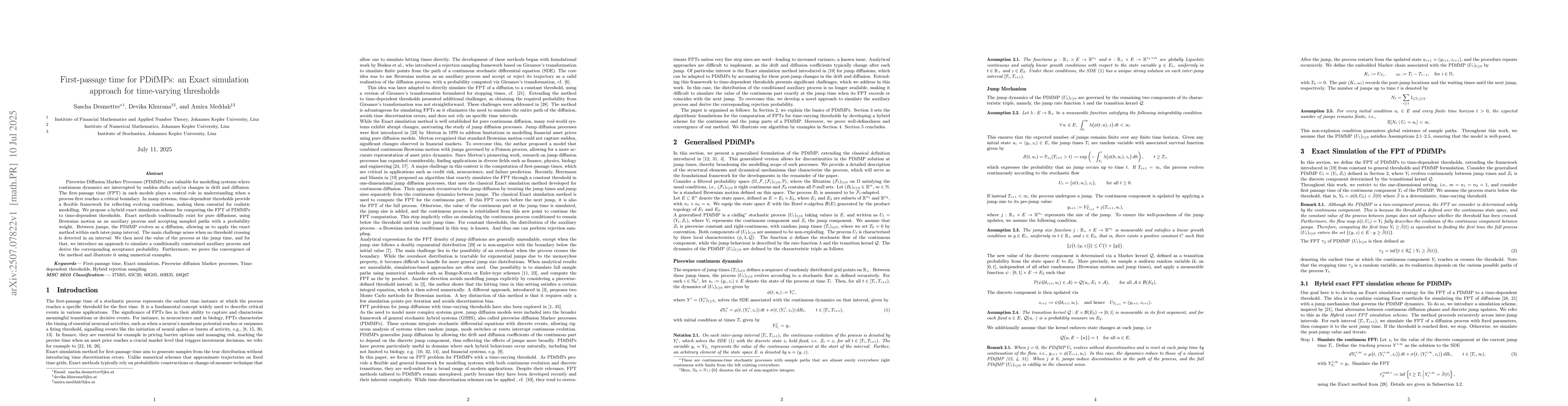 Piecewise Diffusion Markov Processes (PDifMPs) are valuable for modelling systems where continuous dynamics are interrupted by sudden shifts and/or changes in drift and diffusion. The first-passage time (FPT) in such models plays a central role in understanding when a process first reaches a critical boundary. In many systems, time-dependent thresholds provide a flexible framework for reflecting evolving conditions, making them essential for realistic modelling. We propose a hybrid exact simulation scheme for computing the FPT of PDifMPs to time-dependent thresholds. Exact methods traditionally exist for pure diffusions, using Brownian motion as an auxiliary process and accepting sampled paths with a probability weight. Between jumps, the PDifMP evolves as a diffusion, allowing us to apply the exact method within each inter-jump interval. The main challenge arises when no threshold crossing is detected in an interval: We then need the value of the process at the jump time, and for that, we introduce an approach to simulate a conditionally constrained auxiliary process and derive the corresponding acceptance probability. Furthermore, we prove the convergence of the method and illustrate it using numerical examples.