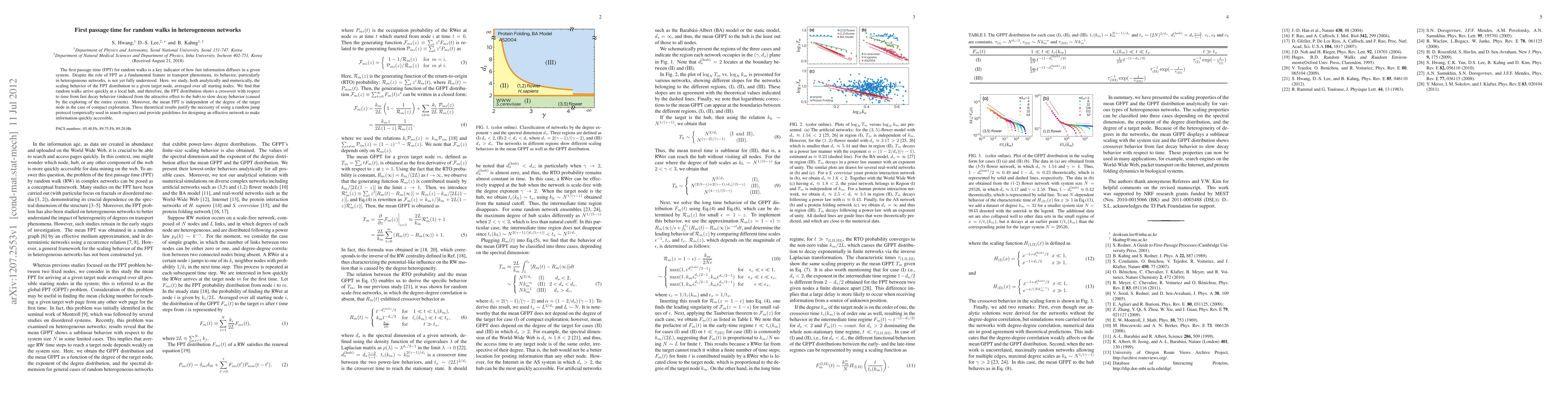 The study analyzes the first passage time (FPT) for random walks in heterogeneous networks using analytical and numerical methods, focusing on the scaling behavior of the FPT distribution to a target node.