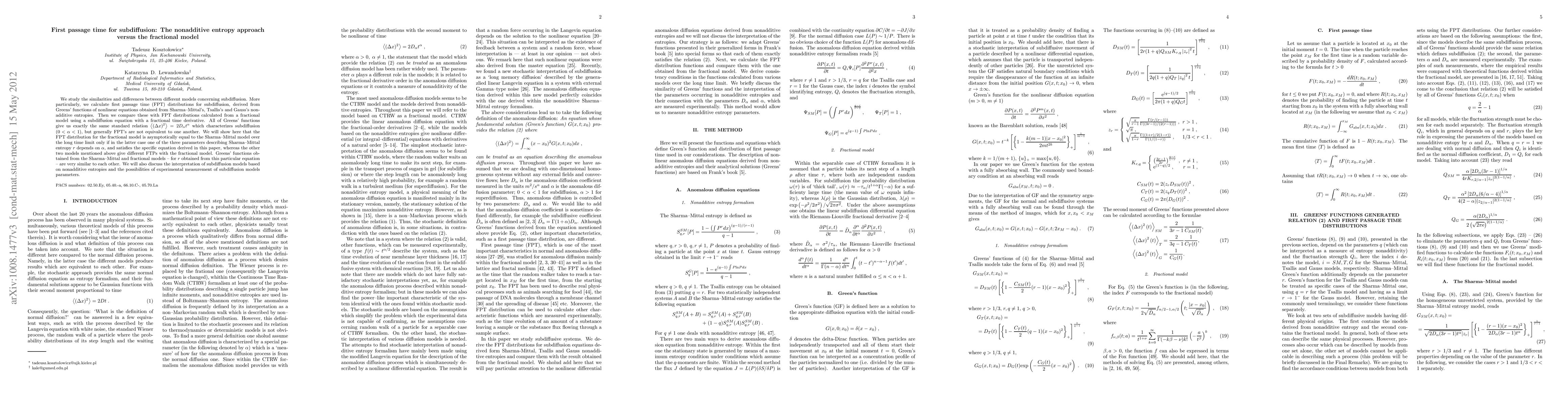 We study the similarities and differences between different models concerning subdiffusion. More particularly, we calculate first passage time (FPT) distributions for subdiffusion, derived from Greens' functions of nonlinear equations obtained from Sharma-Mittal's, Tsallis's and Gauss's nonadditive entropies. Then we compare these with FPT distributions calculated from a fractional model using a subdiffusion equation with a fractional time derivative. All of Greens' functions give us exactly the same standard relation $<(\Delta x)^2> =2 D_\alpha t^\alpha$ which characterizes subdiffusion ($0<\alpha<1$), but generally FPT's are not equivalent to one another. We will show here that the FPT distribution for the fractional model is asymptotically equal to the Sharma--Mittal model over the long time limit only if in the latter case one of the three parameters describing Sharma--Mittal entropy $r$ depends on $\alpha$, and satisfies the specific equation derived in this paper, whereas the other two models mentioned above give different FTPs with the fractional model. Greens' functions obtained from the Sharma-Mittal and fractional models - for $r$ obtained from this particular equation - are very similar to each other. We will also discuss the interpretation of subdiffusion models based on nonadditive entropies and the possibilities of experimental measurement of subdiffusion models parameters.