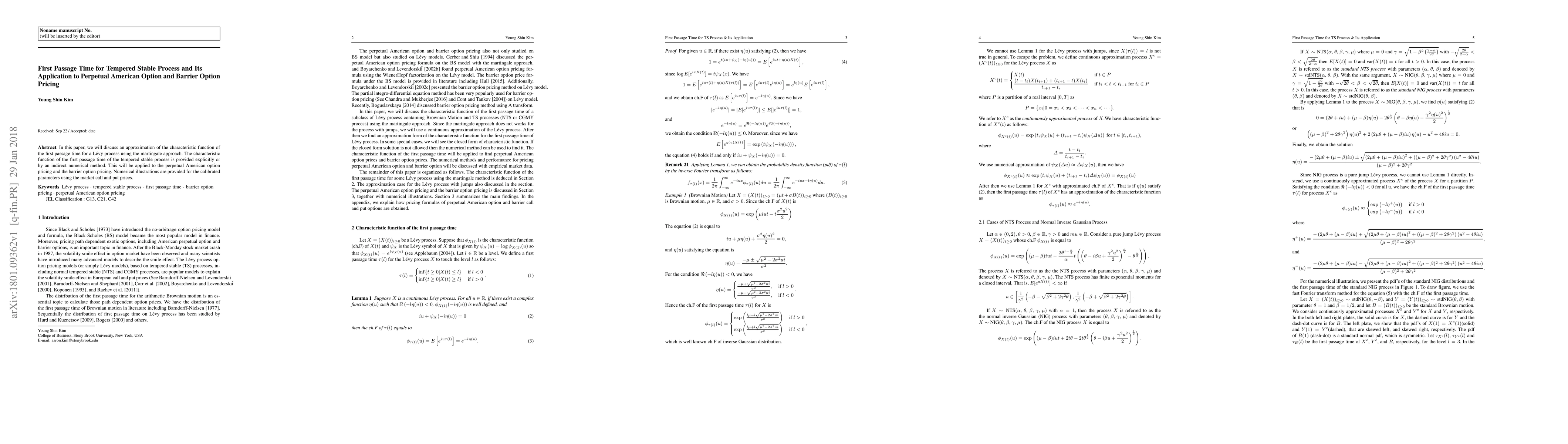 Summary: This paper develops an approximation for the characteristic function of the first passage time for a tempered stable process using a martingale approach, which is then applied to pricing perpetual American and barrier options, supported by numerical illustrations calibrated to market data.