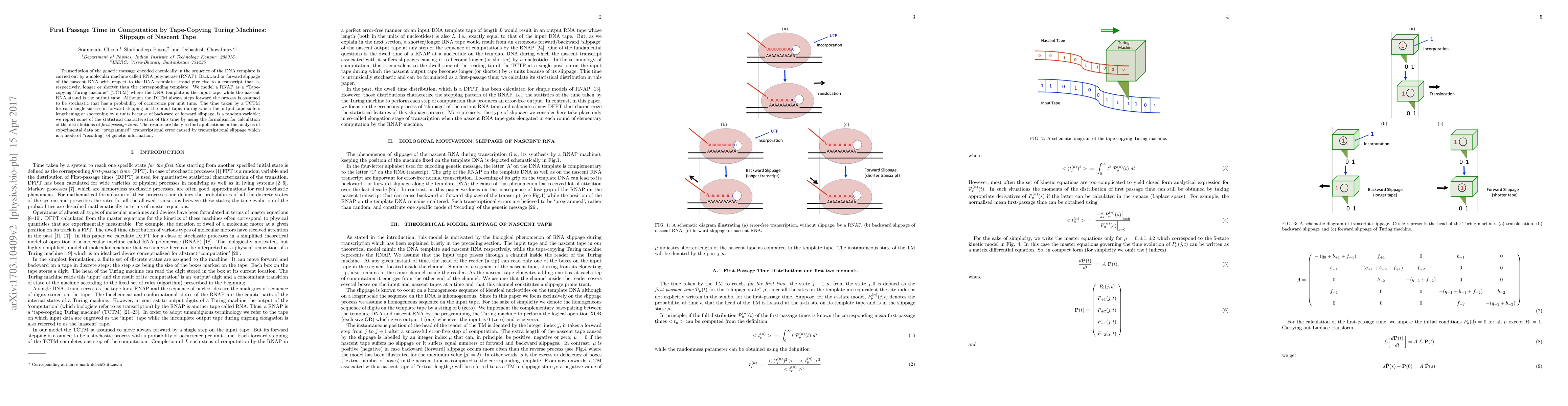 This paper models RNA polymerase as a stochastic Tape-copying Turing machine, analyzing the first passage time for successful forward steps and associated slippage on the RNA strand, providing statistical characteristics that could aid in understanding transcriptional errors from slippage in genetic information recoding.