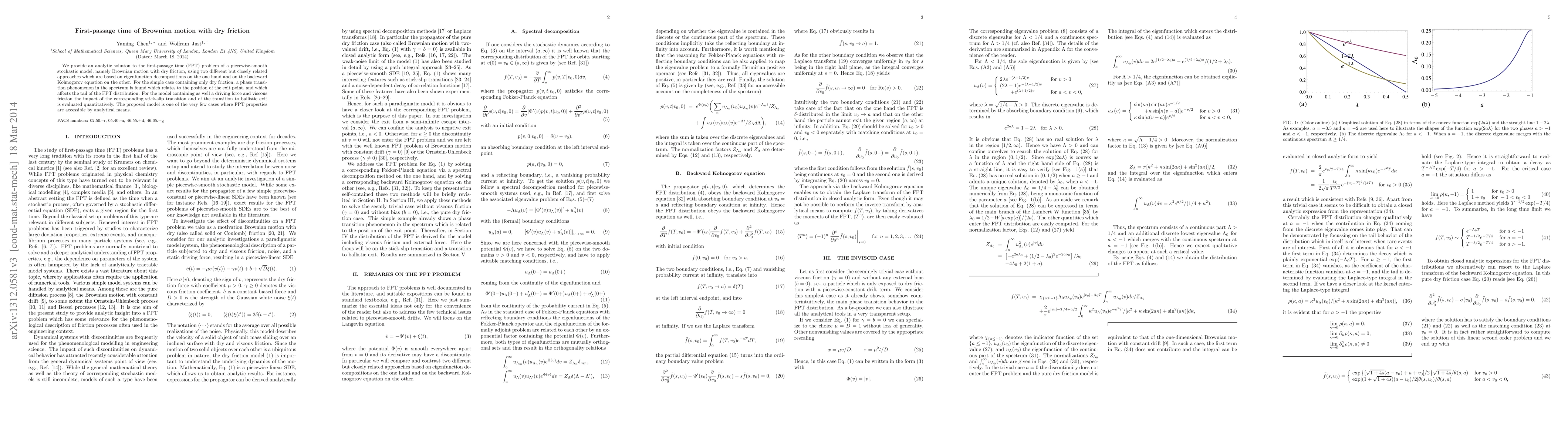 We provide an analytic solution to the first-passage time (FPT) problem of a piecewise-smooth stochastic model, namely Brownian motion with dry friction, using two different but closely related approaches which are based on eigenfunction decompositions on the one hand and on the backward Kolmogorov equation on the other. For the simple case containing only dry friction, a phase transition phenomenon in the spectrum is found which relates to the position of the exit point, and which affects the tail of the FPT distribution. For the model containing as well a driving force and viscous friction the impact of the corresponding stick-slip transition and of the transition to ballistic exit is evaluated quantitatively. The proposed model is one of the very few cases where FPT properties are accessible by analytical means.
