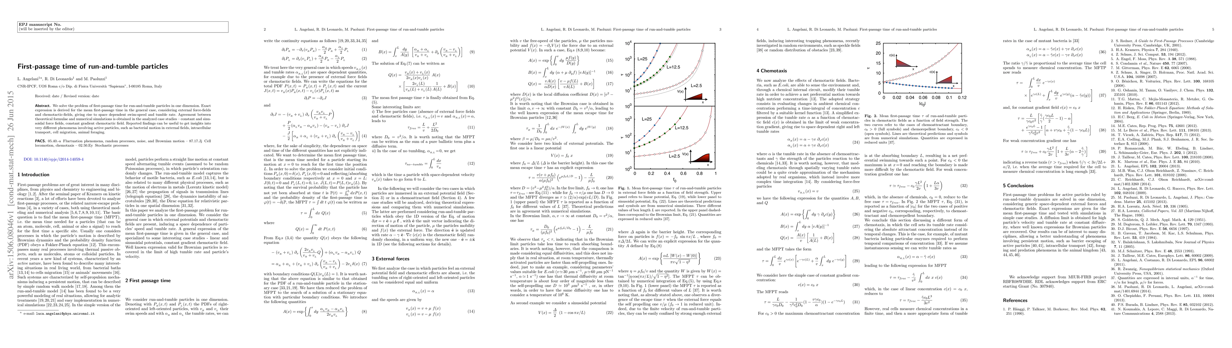 This paper derives the exact mean first-passage time for run-and-tumble particles in one dimension under external and chemotactic fields, showing agreement with simulations for constant and sinusoidal fields. The findings provide insights into active particle phenomena like bacterial motion and cell migration.