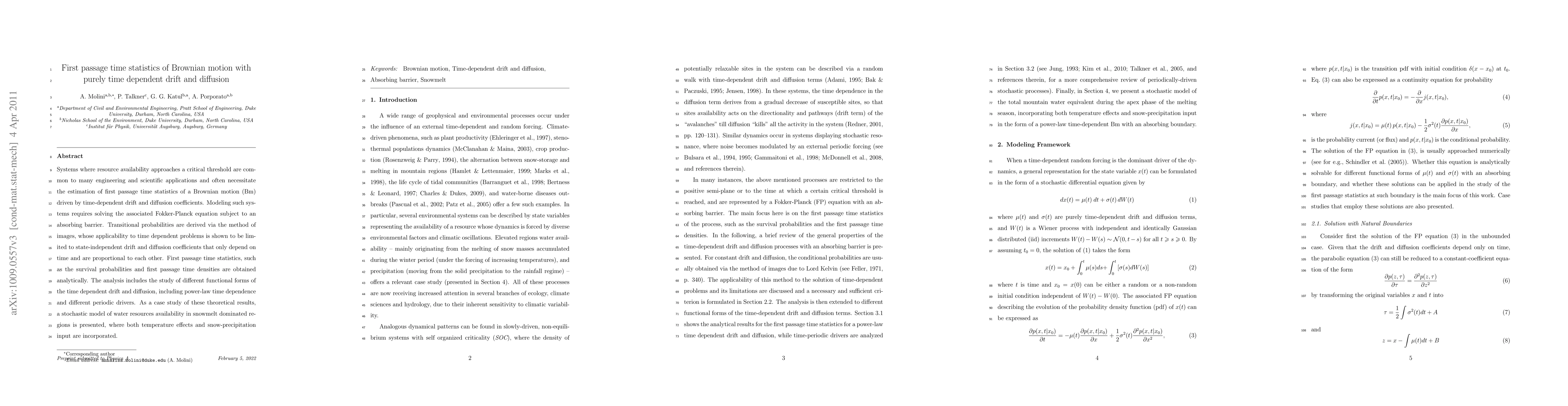 This paper investigates first passage time statistics for Brownian motion with time-dependent drift and diffusion coefficients, deriving analytical solutions for survival probabilities and first passage time densities. It applies these results to a stochastic model of water availability in snowmelt regions, incorporating temperature and precipitation effects.