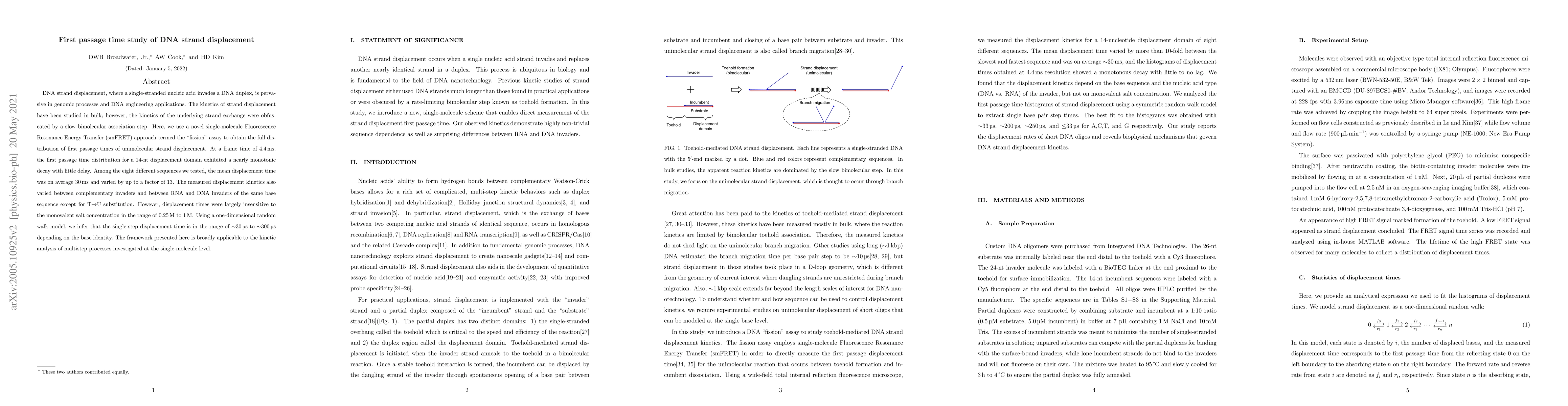 This study employs a single-molecule FRET assay to analyze the kinetics of DNA strand displacement, revealing a nearly monotonic decay in first passage times with an average displacement time of 35 ms across different sequences. The displacement process is largely unaffected by salt concentration but varies with sequence and invader type.