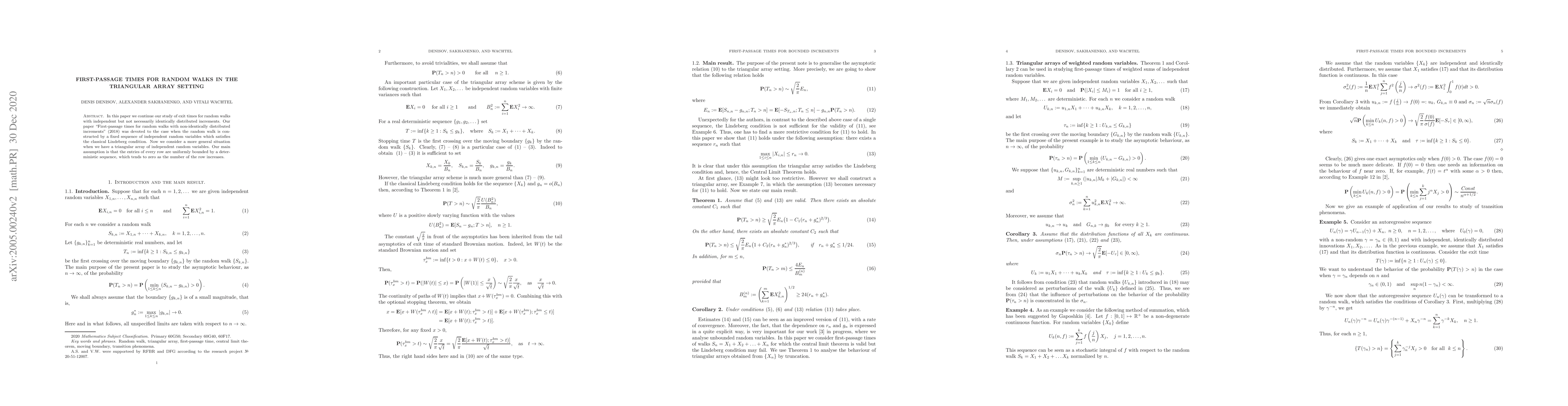 This paper investigates the first-passage times for random walks defined by a triangular array of independent random variables, where each row's entries are uniformly bounded and diminish as the row number increases, diverging from the previously studied fixed sequence model.