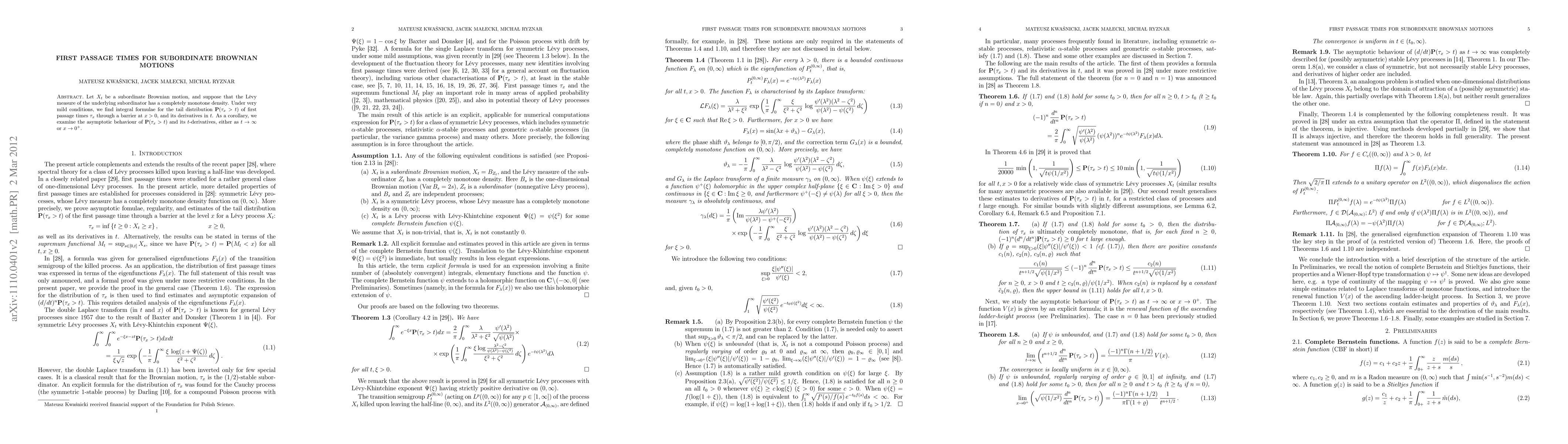 Let X_t be a subordinate Brownian motion, and suppose that the Levy measure of the underlying subordinator has completely monotone density. Under very mild conditions, we find integral formulae for the tail distribution P(\tau_x > t) of first passage times \tau_x through a barrier at x > 0, and its derivatives in t. As a corollary, we examine the asymptotic behaviour of P(\tau_x > t) and its t-derivatives, either as t goes to infinity or x goes to 0.