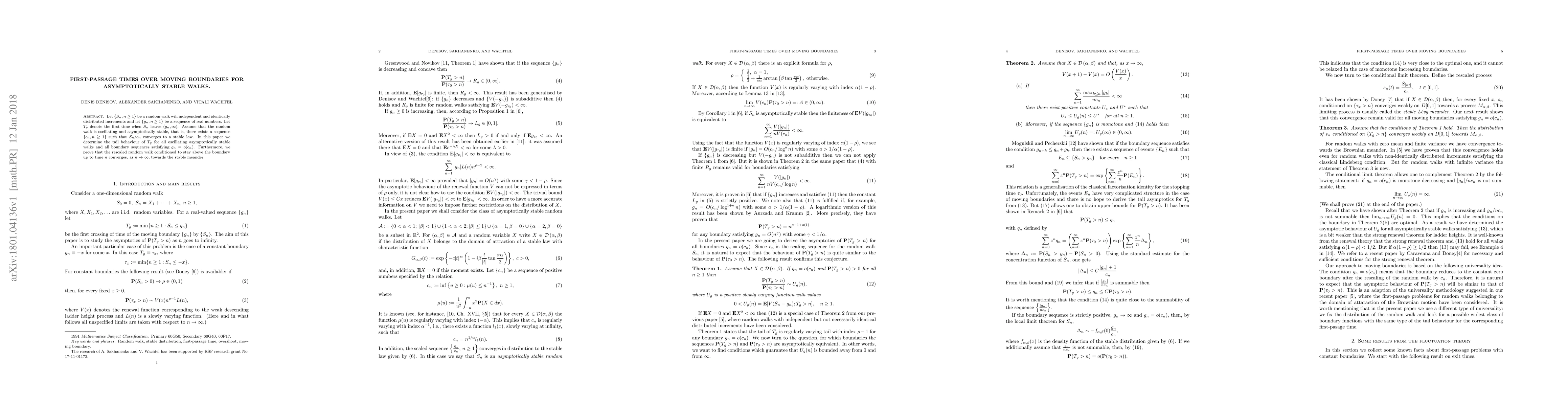 This paper investigates the first-passage times of asymptotically stable random walks over moving boundaries. It determines the tail behavior of these times for walks that are oscillating and asymptotically stable, and proves the convergence of the rescaled random walk conditioned to stay above the boundary to a stable meander.