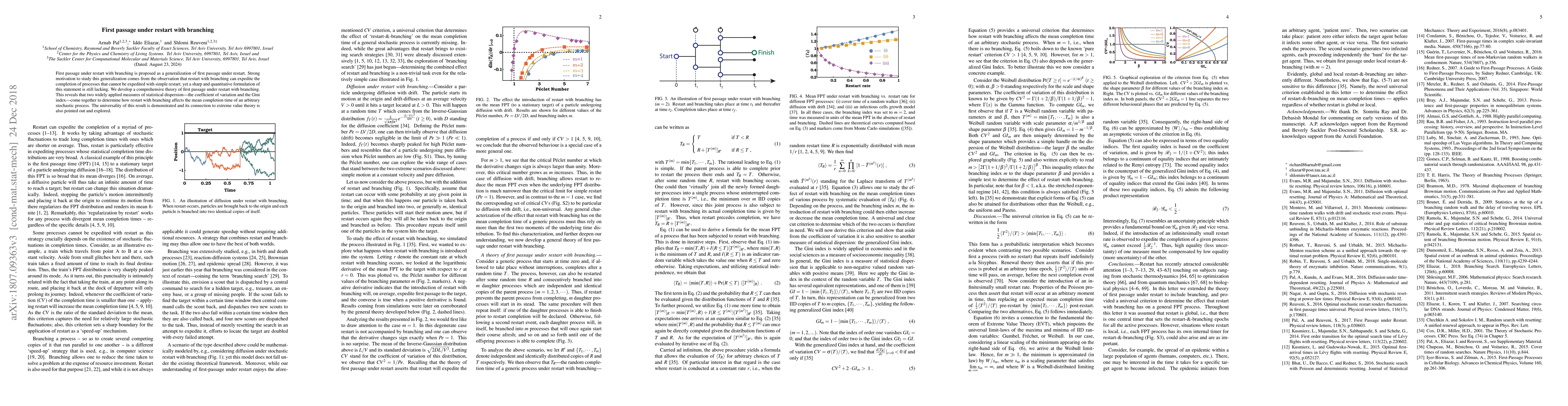 First passage under restart with branching is proposed as a generalization of first passage under restart. Strong motivation to study this generalization comes from the observation that restart with branching can expedite the completion of processes that cannot be expedited with simple restart; yet a sharp and quantitative formulation of this statement is still lacking. We develop a comprehensive theory of first passage under restart with branching. This reveals that two widely applied measures of statistical dispersion---the coefficient of variation and the Gini index---come together to determine how restart with branching affects the mean completion time of an arbitrary stochastic process. The universality of this result is demonstrated and its connection to extreme value theory is also pointed out and explored.