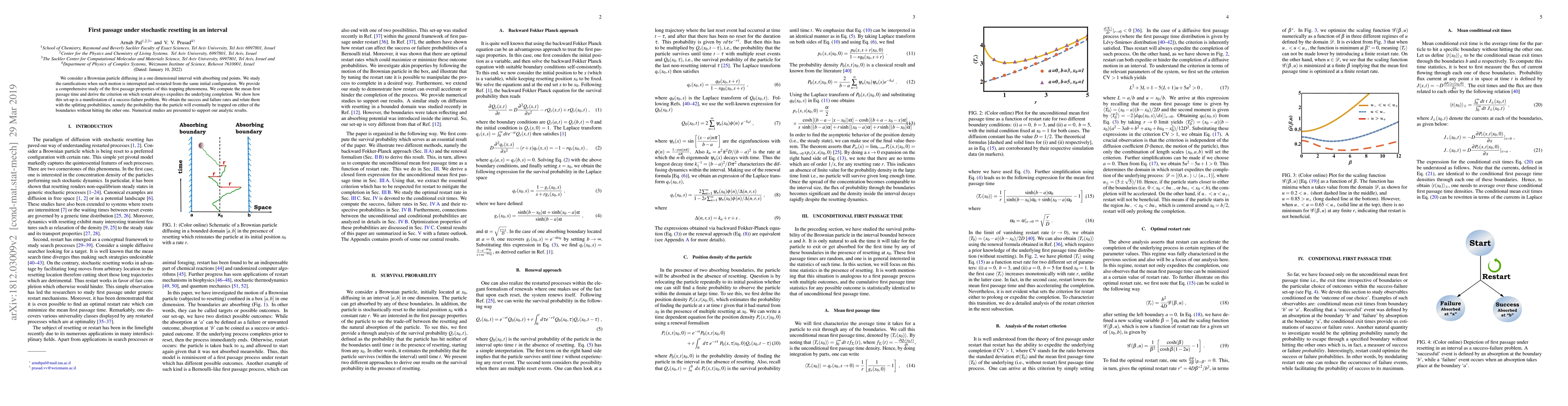 We consider a Brownian particle diffusing in a one dimensional interval with absorbing end points. We study the ramifications when such motion is interrupted and restarted from the same initial configuration. We provide a comprehensive study of the first passage properties of this trapping phenomena. We compute the mean first passage time and derive the criterion upon which restart always expedites the underlying completion. We show how this set-up is a manifestation of a success-failure problem. We obtain the success and failure rates and relate them with the splitting probabilities, namely, the probability that the particle will eventually be trapped on either of the boundaries without hitting the other one. Numerical studies are presented to support our analytic results.
