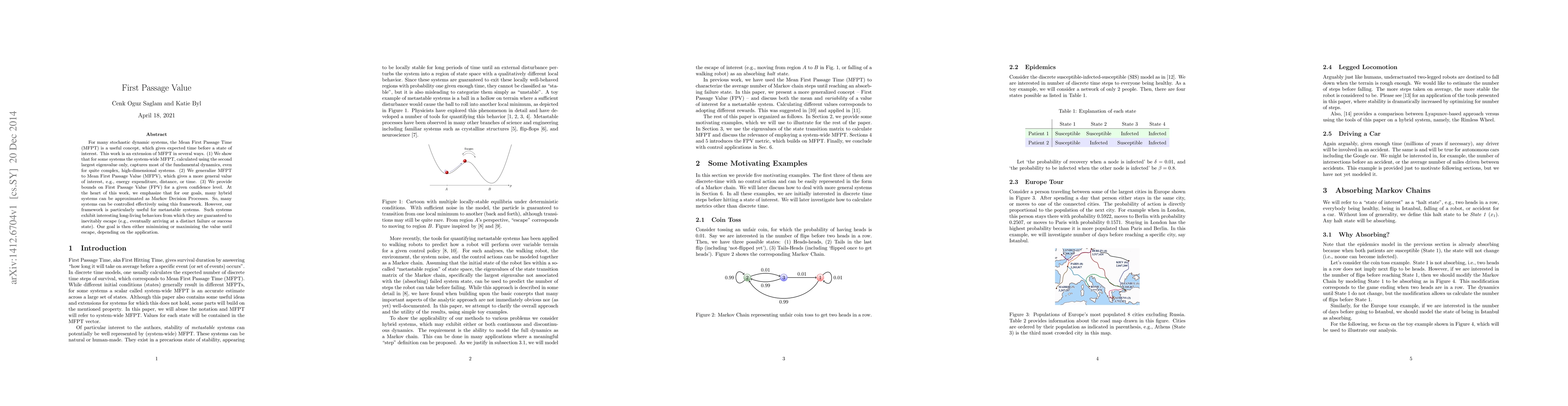 For many stochastic dynamic systems, the Mean First Passage Time (MFPT) is a useful concept, which gives expected time before a state of interest. This work is an extension of MFPT in several ways. (1) We show that for some systems the system-wide MFPT, calculated using the second largest eigenvalue only, captures most of the fundamental dynamics, even for quite complex, high-dimensional systems. (2) We generalize MFPT to Mean First Passage Value (MFPV), which gives a more general value of interest, e.g., energy expenditure, distance, or time. (3) We provide bounds on First Passage Value (FPV) for a given confidence level. At the heart of this work, we emphasize that for our goals, many hybrid systems can be approximated as Markov Decision Processes. So, many systems can be controlled effectively using this framework. However, our framework is particularly useful for metastable systems. Such systems exhibit interesting long-living behaviors from which they are guaranteed to inevitably escape (e.g., eventually arriving at a distinct failure or success state). Our goal is then either minimizing or maximizing the value until escape, depending on the application.