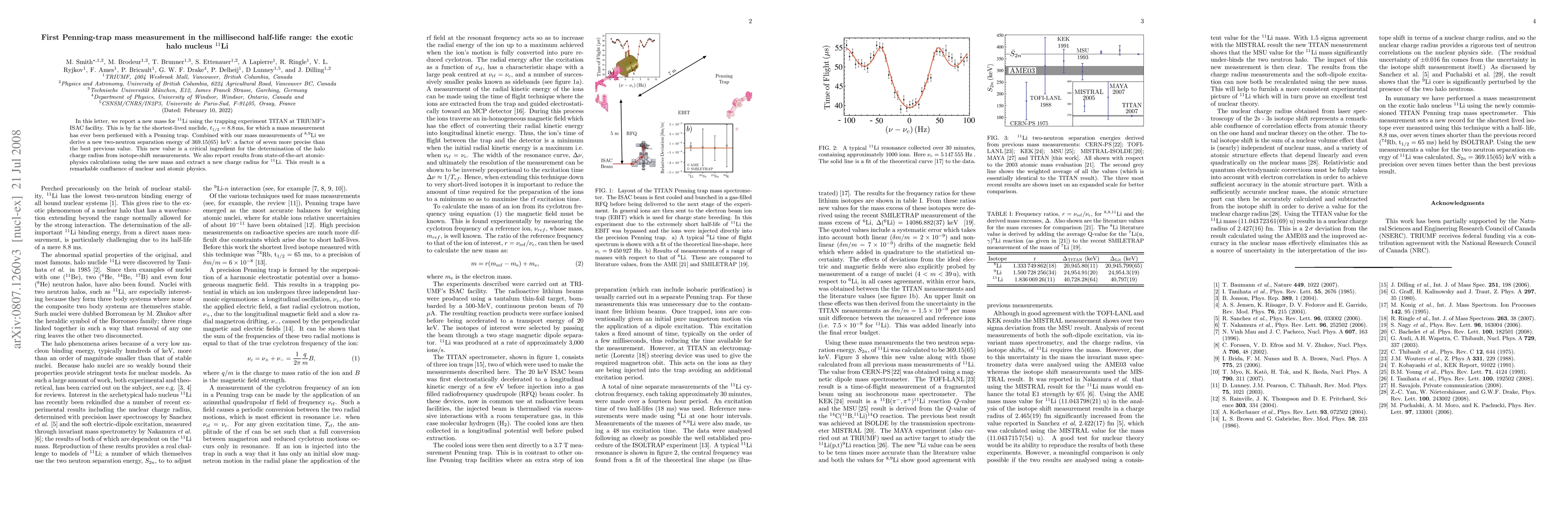 In this letter, we report a new mass for $^{11}$Li using the trapping experiment TITAN at TRIUMF's ISAC facility. This is by far the shortest-lived nuclide, $t_{1/2} = 8.8 \rm{ms}$, for which a mass measurement has ever been performed with a Penning trap. Combined with our mass measurements of $^{8,9}$Li we derive a new two-neutron separation energy of 369.15(65) keV: a factor of seven more precise than the best previous value. This new value is a critical ingredient for the determination of the halo charge radius from isotope-shift measurements. We also report results from state-of-the-art atomic-physics calculations using the new mass and extract a new charge radius for $^{11}$Li. This result is a remarkable confluence of nuclear and atomic physics.
