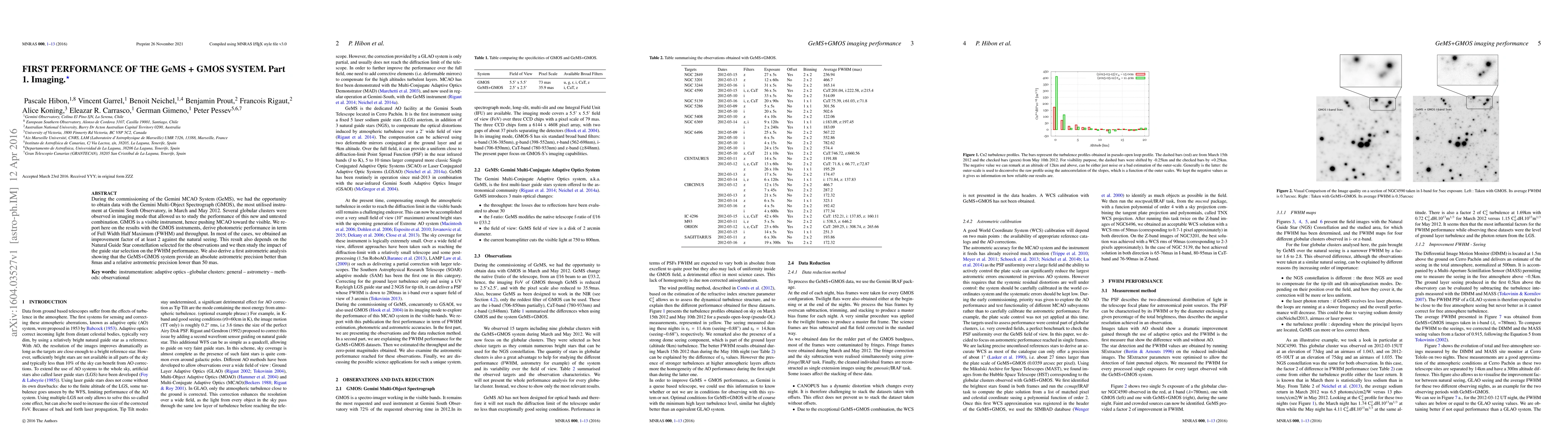 During the commissioning of the Gemini MCAO System (GeMS), we had the opportunity to obtain data with the Gemini Multi-Object Spectrograph (GMOS), the most utilised instrument at Gemini South Observatory, in March and May 2012. Several globular clusters were observed in imaging mode that allowed us to study the performance of this new and untested combination. GMOS is a visible instrument, hence pushing MCAO toward the visible.We report here on the results with the GMOS instruments, derive photometric performance in term of Full Width Half Maximum (FWHM) and throughput. In most of the cases, we obtained an improvement factor of at least 2 against the natural seeing. This result also depends on the Natural Guide Star constellation selected for the observations and we then study the impact of the guide star selection on the FWHM performance.We also derive a first astrometric analysis showing that the GeMS+GMOS system provide an absolute astrometric precision better than 8mas and a relative astrometric precision lower than 50 mas.