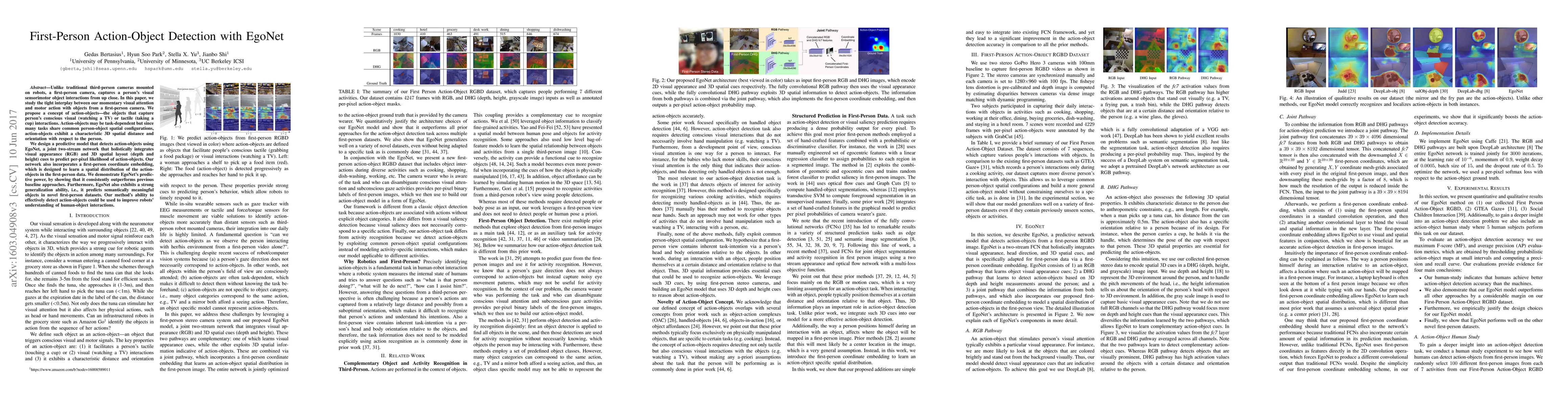 Unlike traditional third-person cameras mounted on robots, a first-person camera, captures a person's visual sensorimotor object interactions from up close. In this paper, we study the tight interplay between our momentary visual attention and motor action with objects from a first-person camera. We propose a concept of action-objects---the objects that capture person's conscious visual (watching a TV) or tactile (taking a cup) interactions. Action-objects may be task-dependent but since many tasks share common person-object spatial configurations, action-objects exhibit a characteristic 3D spatial distance and orientation with respect to the person. We design a predictive model that detects action-objects using EgoNet, a joint two-stream network that holistically integrates visual appearance (RGB) and 3D spatial layout (depth and height) cues to predict per-pixel likelihood of action-objects. Our network also incorporates a first-person coordinate embedding, which is designed to learn a spatial distribution of the action-objects in the first-person data. We demonstrate EgoNet's predictive power, by showing that it consistently outperforms previous baseline approaches. Furthermore, EgoNet also exhibits a strong generalization ability, i.e., it predicts semantically meaningful objects in novel first-person datasets. Our method's ability to effectively detect action-objects could be used to improve robots' understanding of human-object interactions.