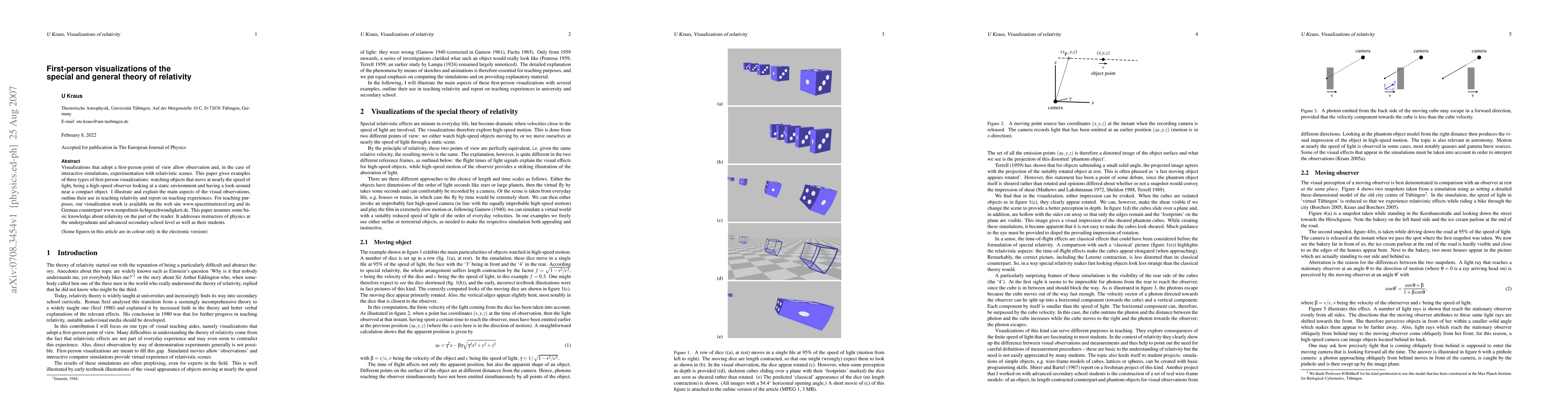 Visualizations that adopt a first-person point of view allow observation and, in the case of interactive simulations, experimentation with relativistic scenes. This paper gives examples of three types of first-person visualizations: watching objects that move at nearly the speed of light, being a high-speed observer looking at a static environment and having a look-around near a compact object. I illustrate and explain the main aspects of the visual observations, outline their use in teaching relativity and report on teaching experiences. For teaching purposes, our visualization work is available on the web site http://www.spacetimetravel.org and its German counterpart http://www.tempolimit-lichtgeschwindigkeit.de . This paper assumes some basic knowledge about relativity on the part of the reader. It addresses instructors of physics at the undergraduate and advanced secondary school level as well as their students.